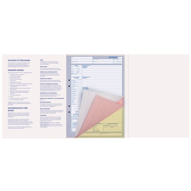 Byggarbetsplatsdagbok för dokumentation av entreprenader. AB 04 anger att entreprenören ska föra dagbok över omständigheter av betydelse för entreprenaden. Anteckningar som förs i dagboken är väderleksförhållanden, arbetsstyrka, direktiv, besiktningarpåbörjade arbeten, pågående arbeten, färdiga arbeten, avvikelser störningar och ändringar m m. Dagboken skrivs i rapportset om tre exemplar (original + 2 självkopierande kopior). Dagboken innehåller även SKYDDSRONDSRAPPORT som förs i rapportset om 3 exemplar (original + 2 självkopierande kopior.