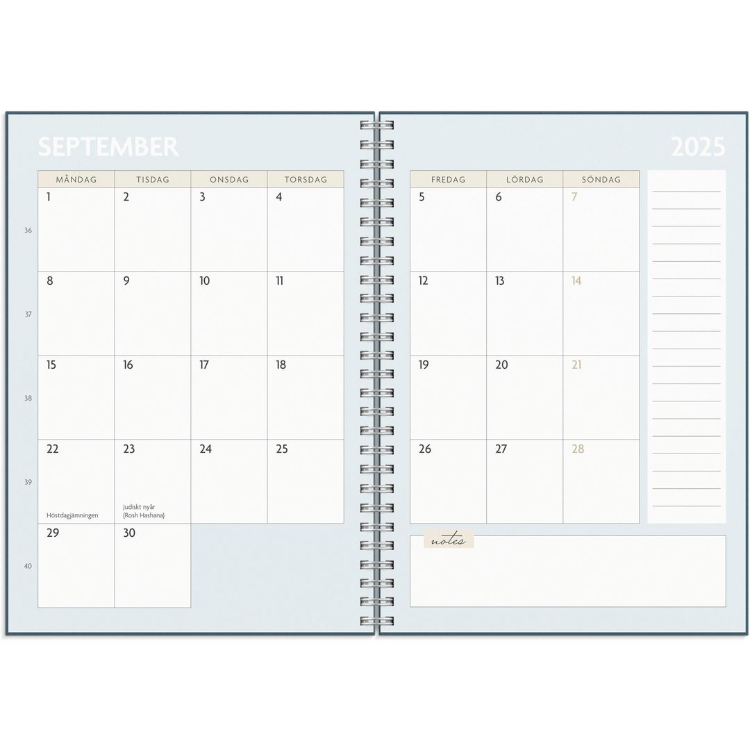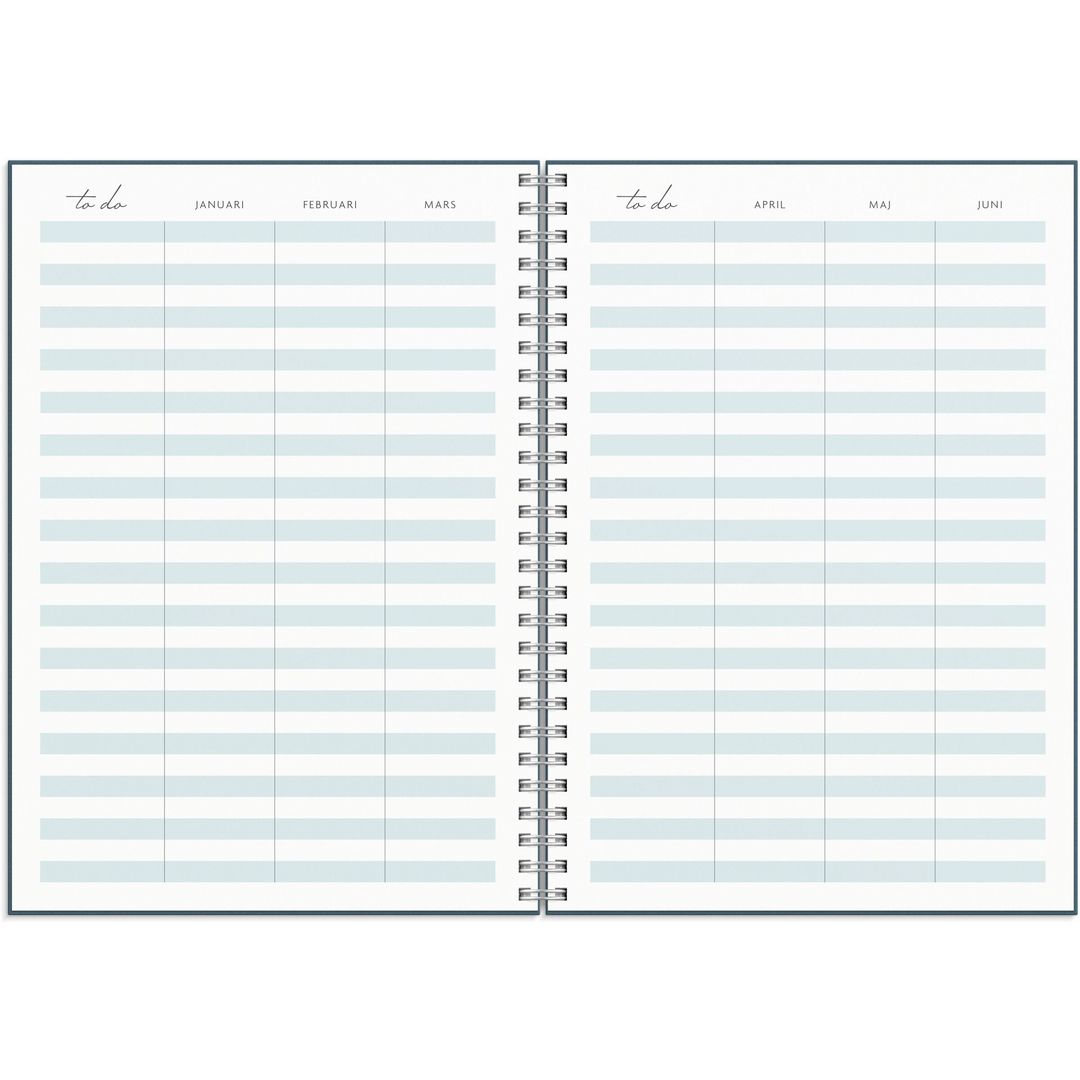 Innehåll: Årsöversikter, årsplan, månadsöverikt, planeringslistor, anteckningssidor med prickar och linjer.