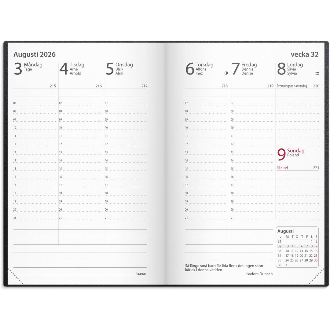 Kalender med en vecka per uppslag, timindelad 7-21. Årsplaner för innevarande. Telefonregister och atlas.