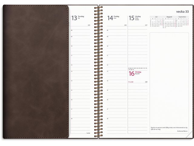 Kalender med mjuk pärm i konstläder med den populära flärpen som kan användas som bokmärke. Att ha flyt på jobbet handlar till stor del om konsten att planera. Det här är kalendern för dig som vet att arbetsdagen lätt blir hektiskt och snabbt fylls på med möten och uppgifter, och vill ha bra översikt över din veckoplanering. När du vet vad som väntar varje dag blir du mer effektiv och chansen är större att du når dina karriärmål.