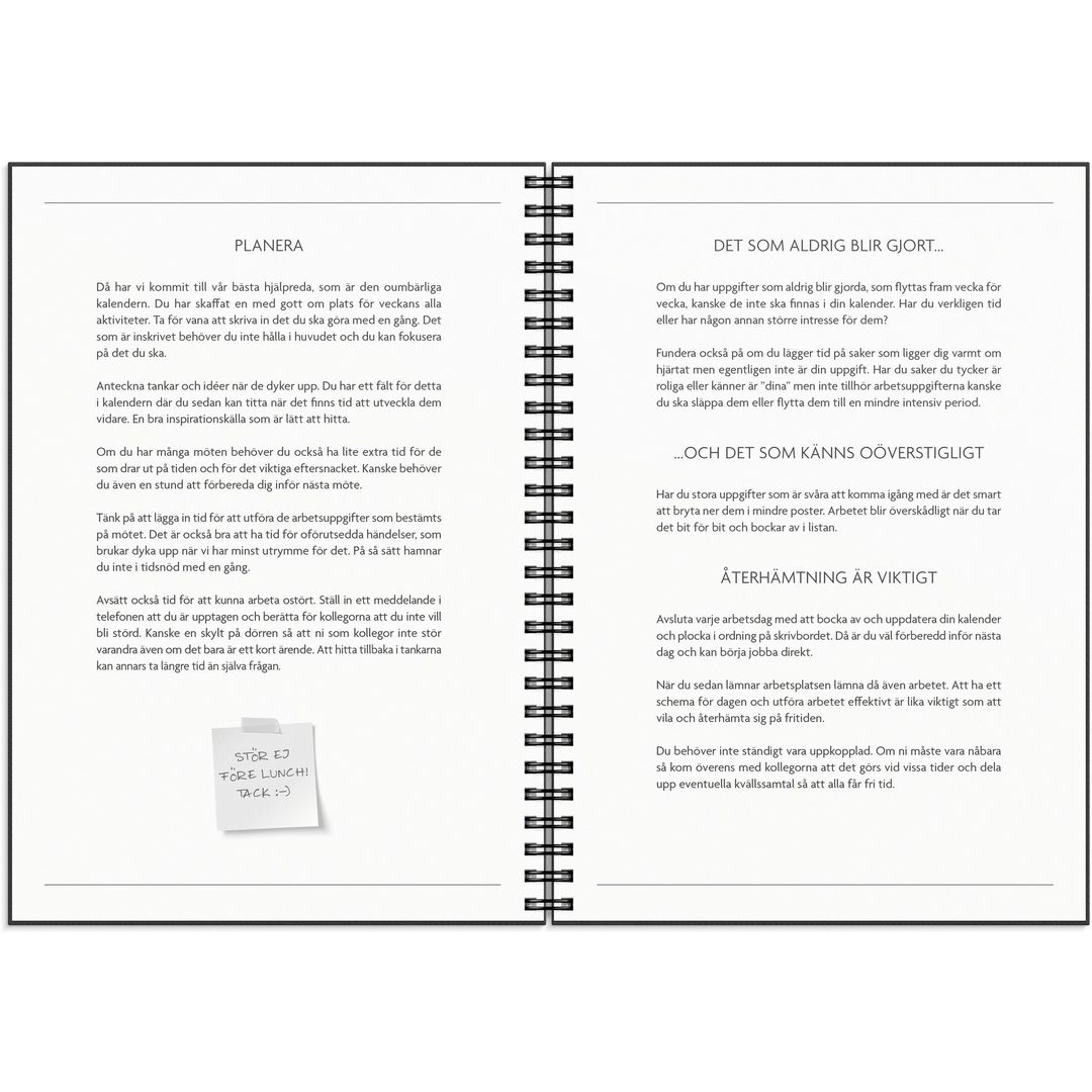 Det är kombinationen analogt och digitalt som kan bidra till de kraftfullaste insikterna. Få det Gjort är en smakfull kalender med bra möjlighet att komplettera dina redan existerande tekniska lösningar eller fördjupa strukturen när du väljer att verka off-line. A5 kalendern har veckouppslag med hela veckan i en horisontell layout på vänster sida och till höger finner du olika listor för inköp, prioriteringar och möten. Allt i en vacker gråskalig formgivning. Lägg till ett stilfullt omslag eller uppskatta den stilrena svart/vita designen precis som den är. Med Få Det Gjort sätter du reglerna!