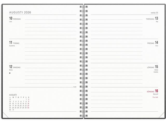 Kalender med löst omslag med slejf, fyra kreditkortsfickor, en större ficka och pennhållare. En layout där fokus ligger på tydlig planering. Inlagan passar dig som har mycket på gång, oavsett veckodag. Kalendern är enkel och tydlig med lika mycket utrymme för både vardag och helg.