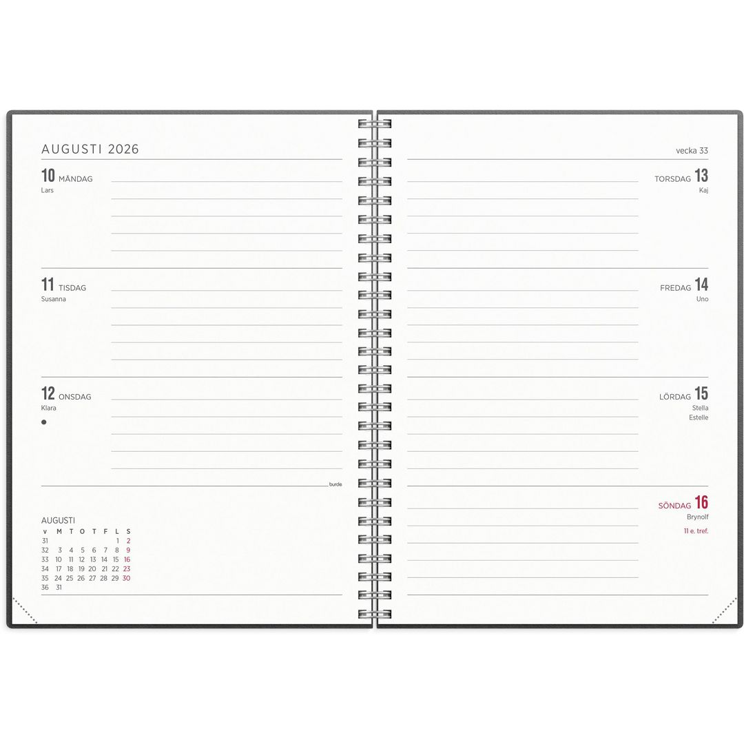 Kalender med löst omslag med fyra kreditkortsfickor, en större ficka och pennhållare. En layout där fokus ligger på tydlig planering. Inlagan passar dig som har mycket på gång, oavsett veckodag. Kalendern är enkel och tydlig med lika mycket utrymme för både vardag och helg.