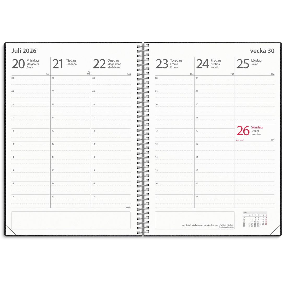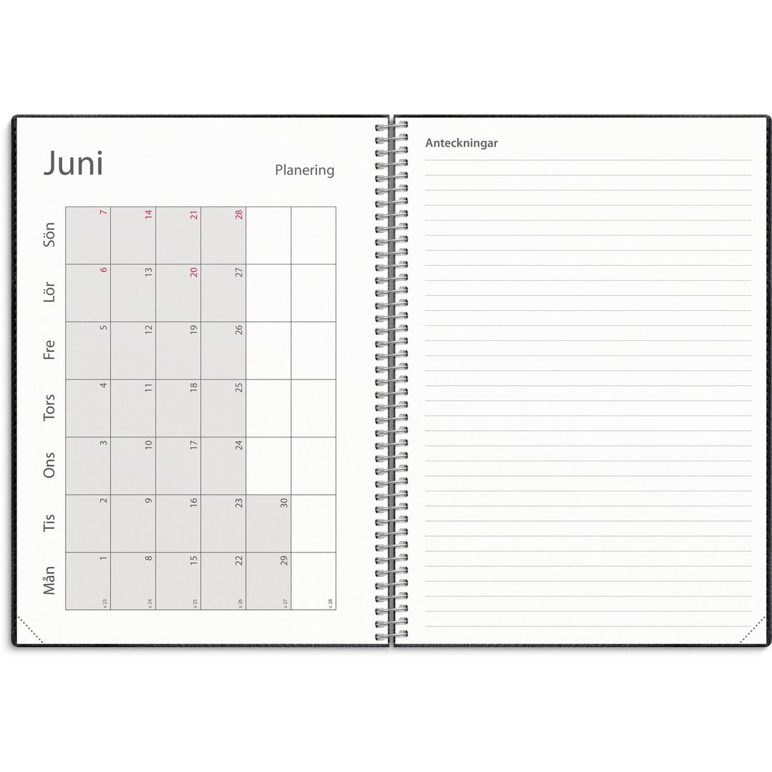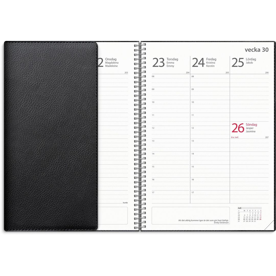 Study A5 är en praktisk kalender för den studerande. Med en inlaga med stående layout samt timindelning 8-17 hjälper Study dig att behålla strukturen genom hela läsåret. Det finns även utrymme för att skriva upp årsplaner, scheman och provresultat för att lättare kunna reflektera över akademisk utveckling. För att underlätta organiseringen har Study även en praktisk förvaringsficka. Allt du behöver för ett framgångsrikt läsår! Twist Svart är i en len strukturerad skinnimitation med en användbar flärp som kan fungera som ett bokmärke för att enkelt förflytta dig i kalendern. Den svala svarta färgen är klassisk och går aldrig ur tiden. Kalendern får en tidlös elegans.