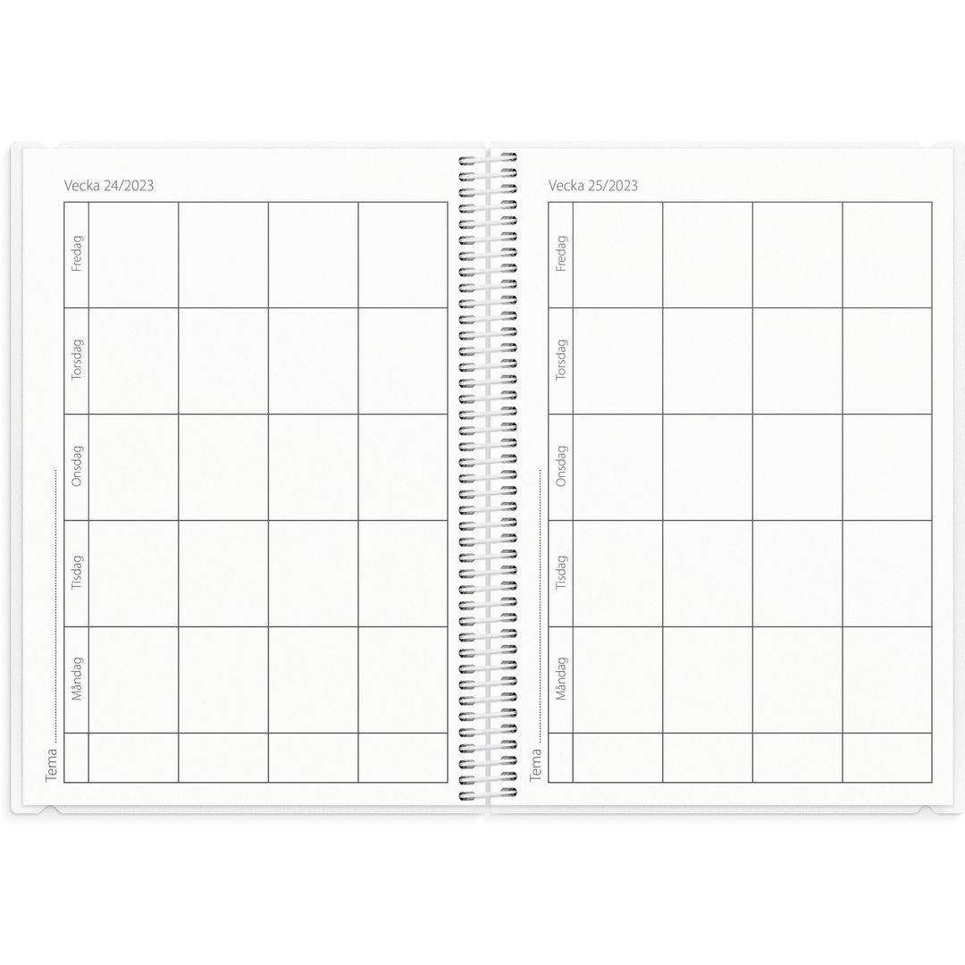 Effektivisera din vardag som förskolelärare med hjälp av en veckokalender för förskolelärare i det smidiga formatet A5 som ett analogt komplement till din digitala planering. Planera och tydliggör dina dagar och terminer med papper och penna och få ett ögonblick av reflektion och fokuserad planering. Kalendern skänker även en möjlighet till reflektion över utmaningar och framgångar i din vardag som lärare. Veckokalendern riktar sig till lärare i förskolan, med sidor som anpassats för det arbetssättet, t ex barnförteckning och veckoscheman för temaplanering mm. Kalendern har ett utbytbart framsidemotiv.