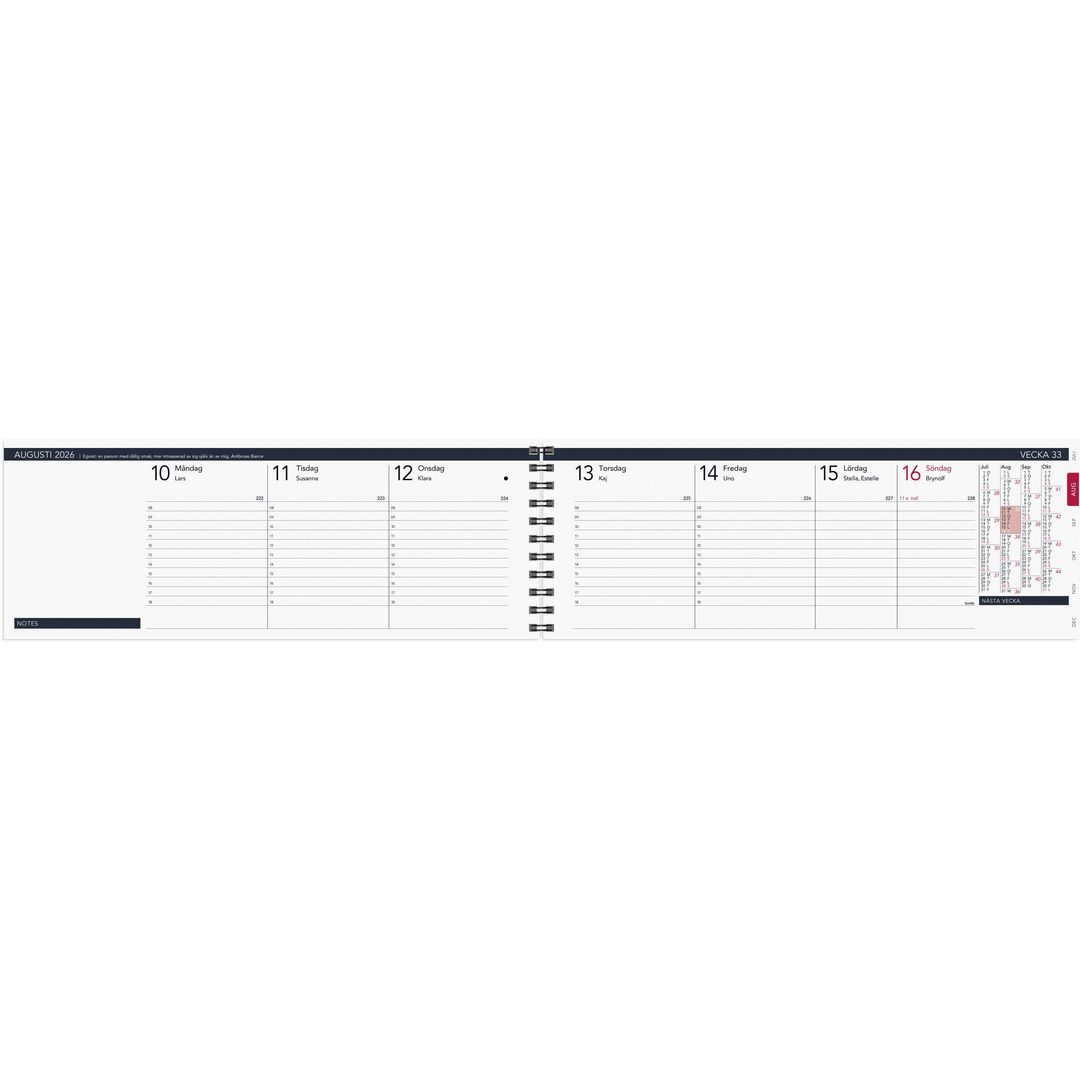 En vecka per uppslag. Timindelad 8-18. Format: 510x95 mm (uppslagen).