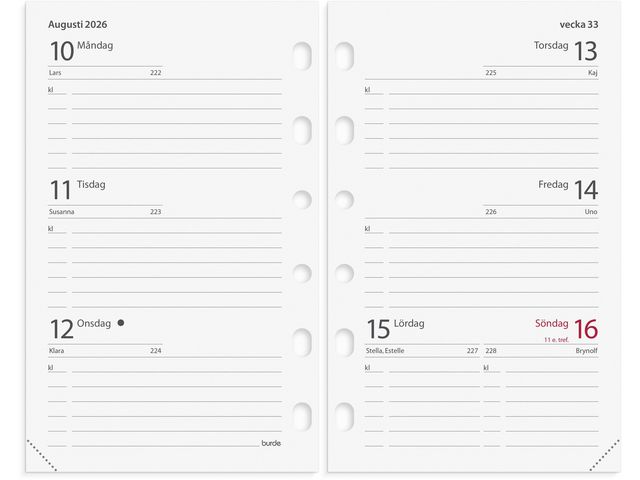 ● Innehåll: Adresseregister, Budget, Kassabok, Kyrkliga helgdagar, Körjournal, Flaggdagar, Helgdagar/aftnar, Månfaser, Flyttbar markör/linjal, Namnsdagar, Anteckningssidor, Internationella helgdagar översikt, Projektarbete, Register a-ö, Flikregister, Temadagar/händelser, To-do, Årsöversikt/årsöversikter, Årsplan/årsplaner