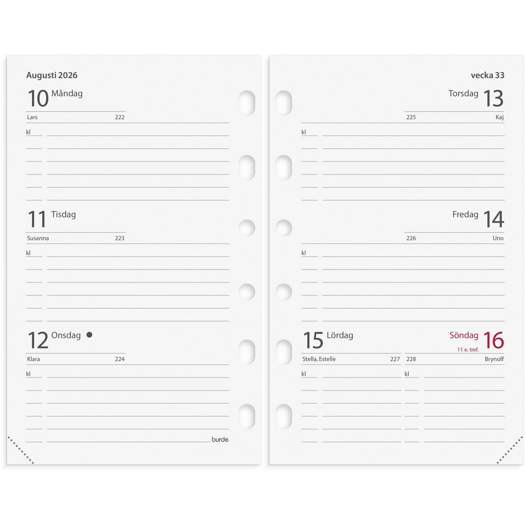 ● Innehåll: Budget, Kassabok, Kyrkliga helgdagar, Körjournal, Flaggdagar, Helgdagar/aftnar, Månfaser, Flyttbar markör/linjal, Namnsdagar, Anteckningssidor, Internationella helgdagar översikt, Projektarbete, Register a-ö, Flikregister, Telefonregister, Temadagar/händelser, To-do, Årsöversikt/årsöversikter, Årsplan/årsplaner