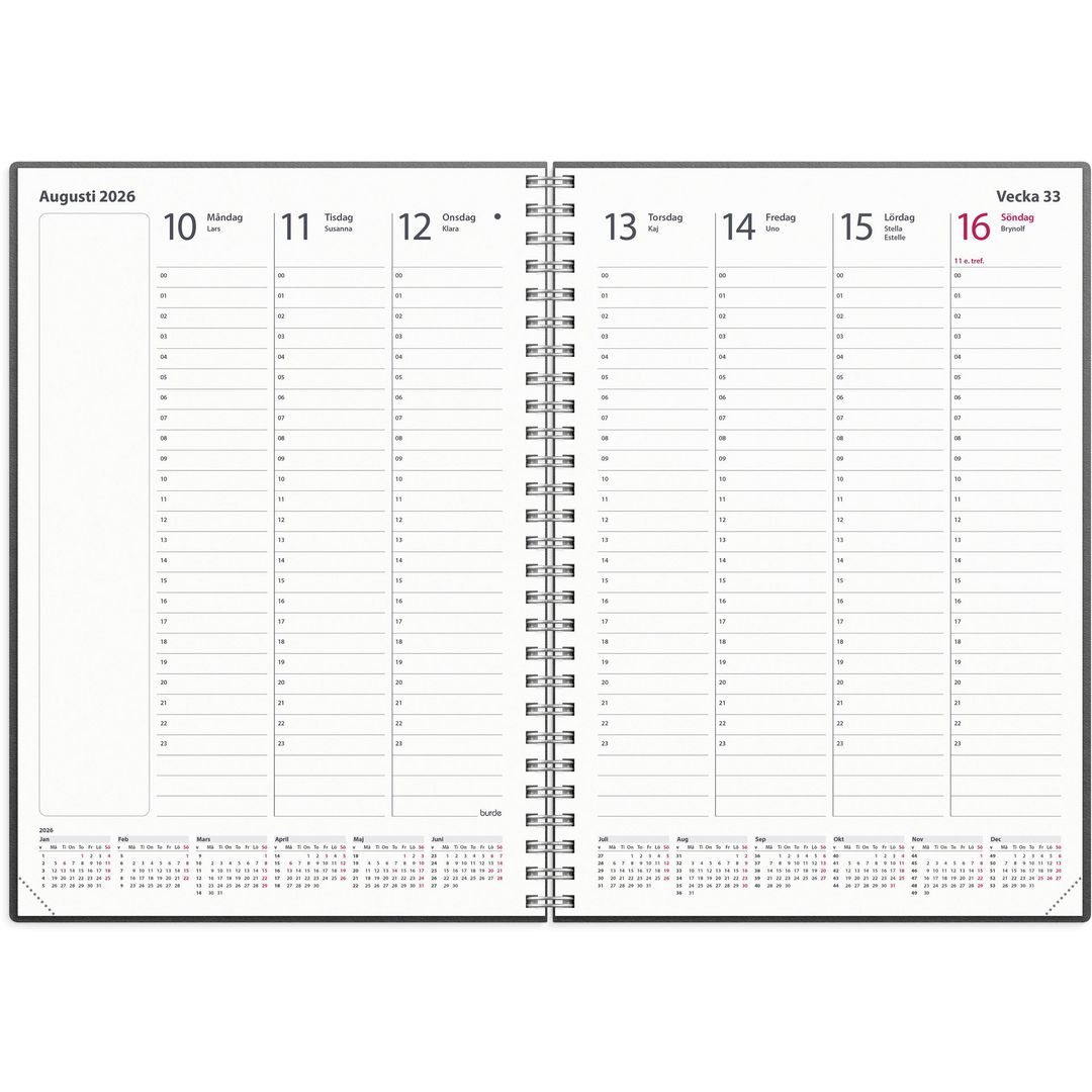 ● Layout: Stående. Vecka/uppslag. Timindelning 00-23