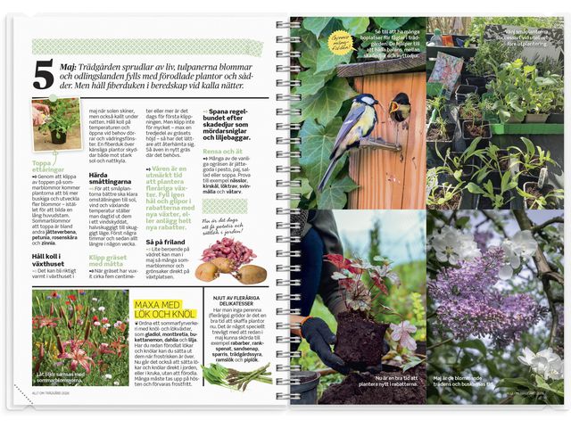 Tillsammans med tidningen Allt om Trädgård har Burde tagit fram en trädgårdskalender som hjälper dig att planera hela odlingsåret. Varje månad inleds med ett inspirerande uppslag där du får tips och påminnelser om vad som behöver göras i trädgården baserat på tiden på året, därefter följer vanlig klassisk veckoplanering. Det tåliga omslaget i plast gör att du kan ha med kalendern ut i odlingarna utan att innehållet skadas av jord och vatten. Planera smart och nå dina odlingsdrömmar!