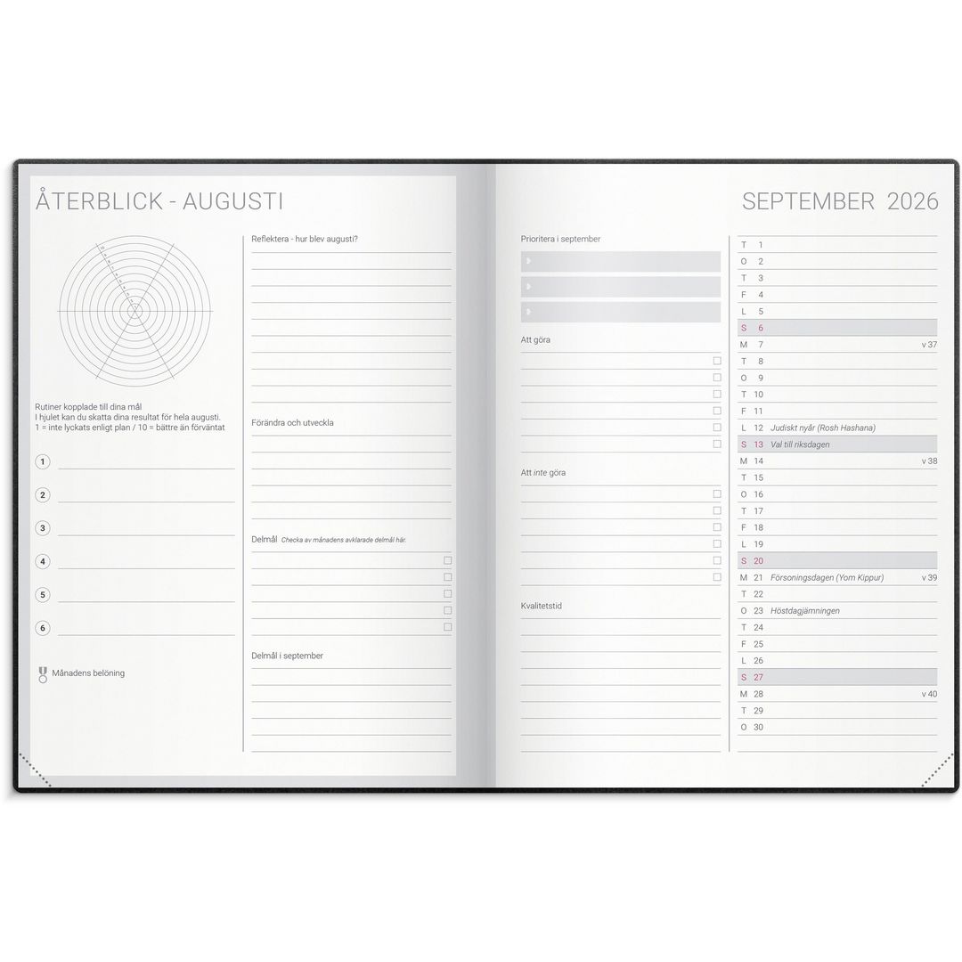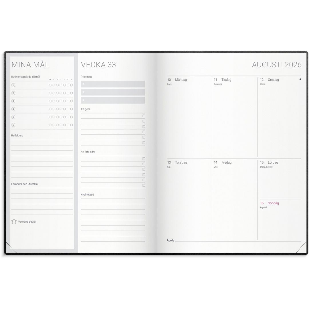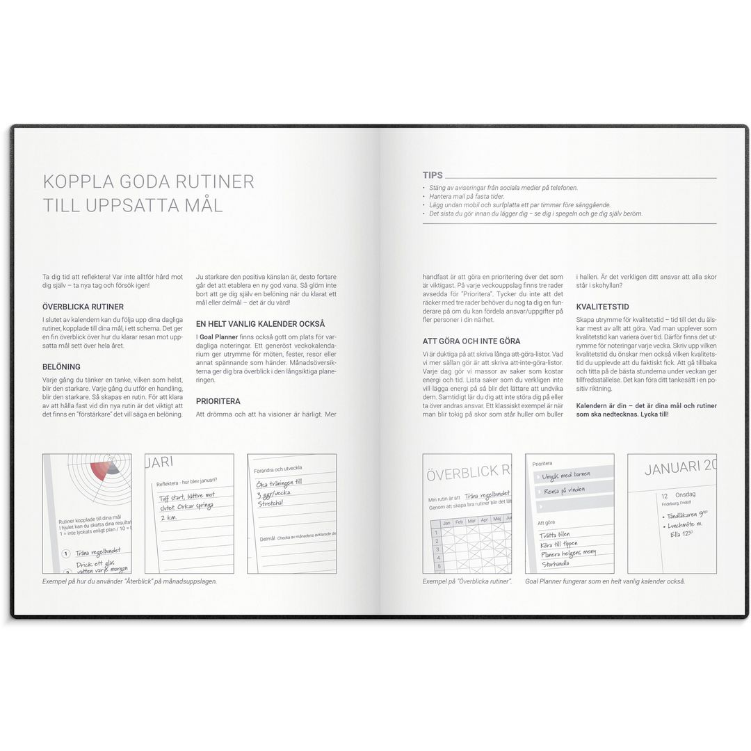 Att sätta upp mål, kämpa och slutligen lyckas är en rejäl boost för självkänslan! Oavsett vad du vill åstadkomma eller förändra är Burde s Goal Planner din optimala stöttepelare längs vägen. Du får hjälp med delmål, reflektioner, belöningar och din dagliga planering, såklart. Kalendern har ett stilrent omslag i svart konstläder med gummiband och märkband.