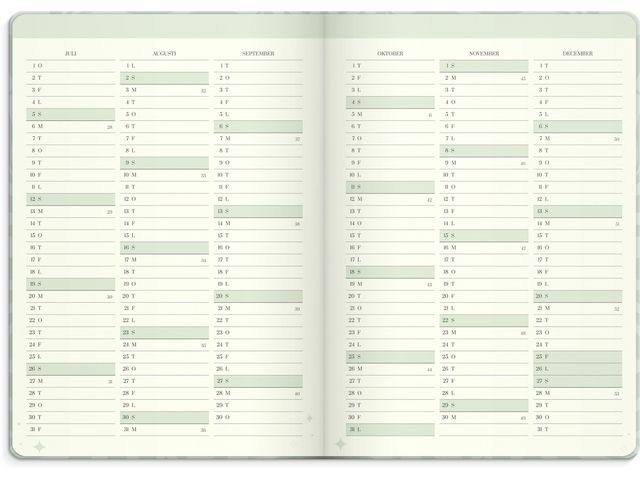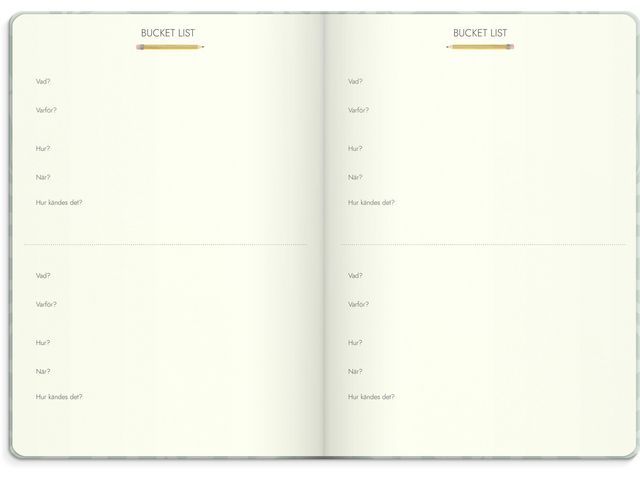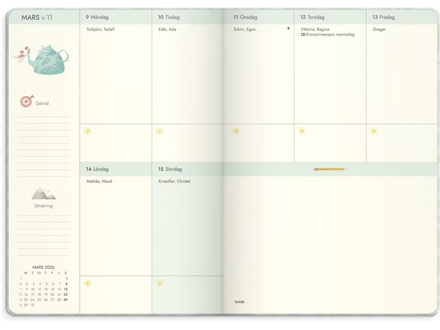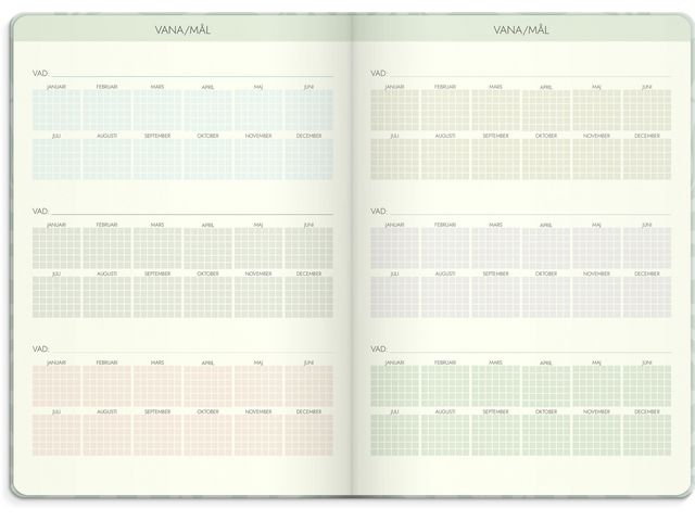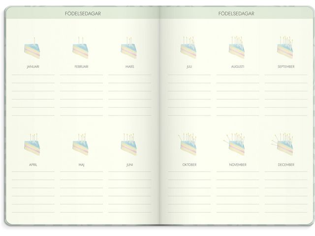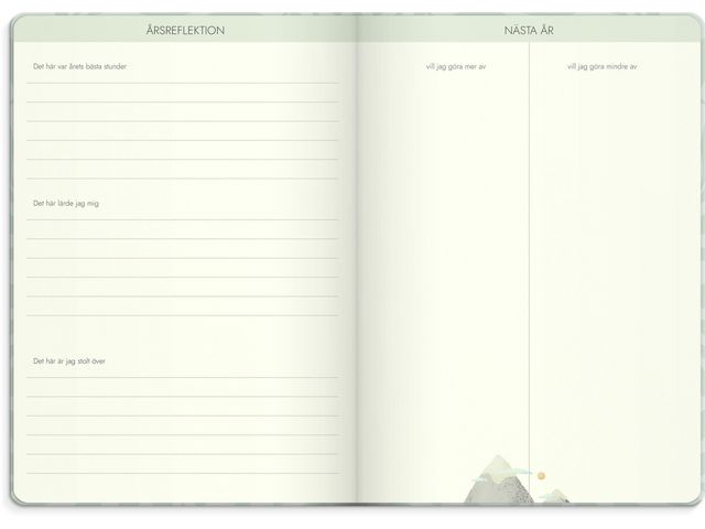 ● Innehåll: Årsmål, Födelsedagslista, Bucketlist, Checklista, Flaggdagar, Helgdagar/aftnar, Moodboard, Månfaser, Namnsdagar, Anteckningssidor prickade, Anteckningssidor linjerade, Temadagar/händelser, Årsplan/årsplaner, Årsreflektioner