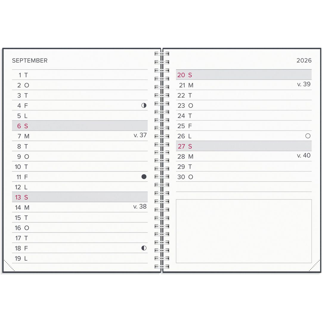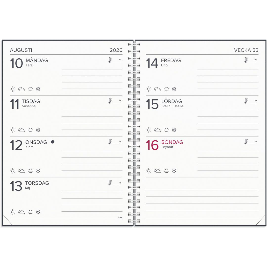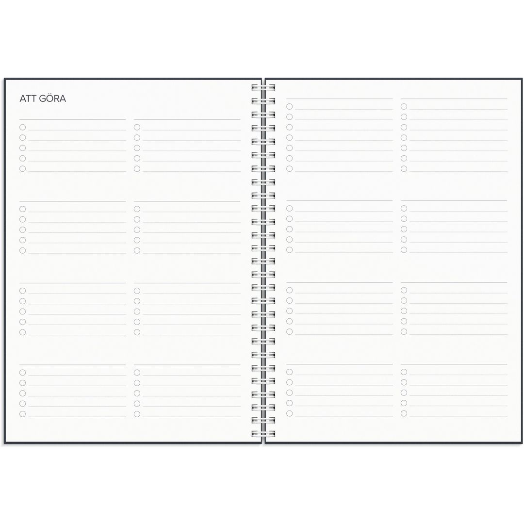 ● Detaljer: Gummiband. Innehåll: Flaggdagar, Helgdagar/aftnar, Månfaser, Namnsdagar, Anteckningssidor linjerade, Temadagar/händelser, To-do, Årsplan/årsplaner