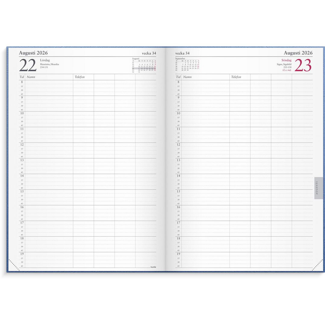 Inbunden kalender avsedd för bokning av tider, detaljerad tidsplanering etc. Kalendern har en dag per sida, kvartsindelad mellan 8-20. Fem kolumner varav tre fria.