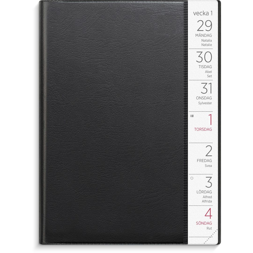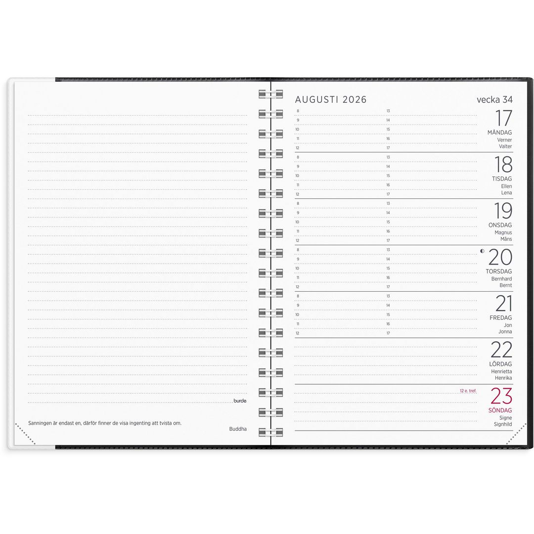 Kalender med en vecka per uppslag. Hela vänster sida på alla uppslag är linjerade. Timindelad 8-17. Årsplaner för innevarande och följande år samt inbundet telefonregister.