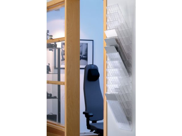 Blankettfack med 12 fack för förvaring och presentation av blanketter i stående A4-format. Produkten är avsedd för väggmontering och levereras komplett med skruv och plugg, vilket gör installationen enkel och smidig.