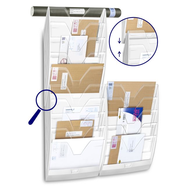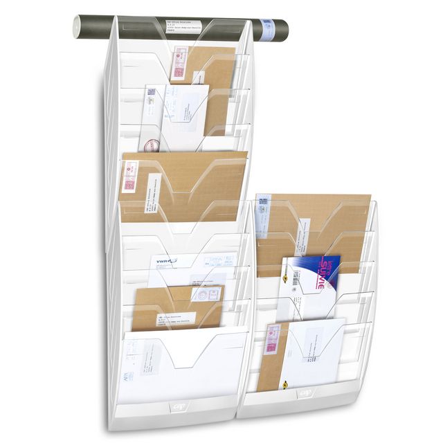 CEP ReCeption 154 vägghylla är tillverkad av stöttålig och återvinningsbar polystyren och erbjuder en attraktiv men samtidigt mycket praktisk förvaringslösning. Den är idealisk för visning och organisering av stora och tjocka dokument såsom broschyrer, kataloger och tidningar. Dokument kan placeras både vertikalt och horisontellt, vilket ger stor flexibilitet i användningen.