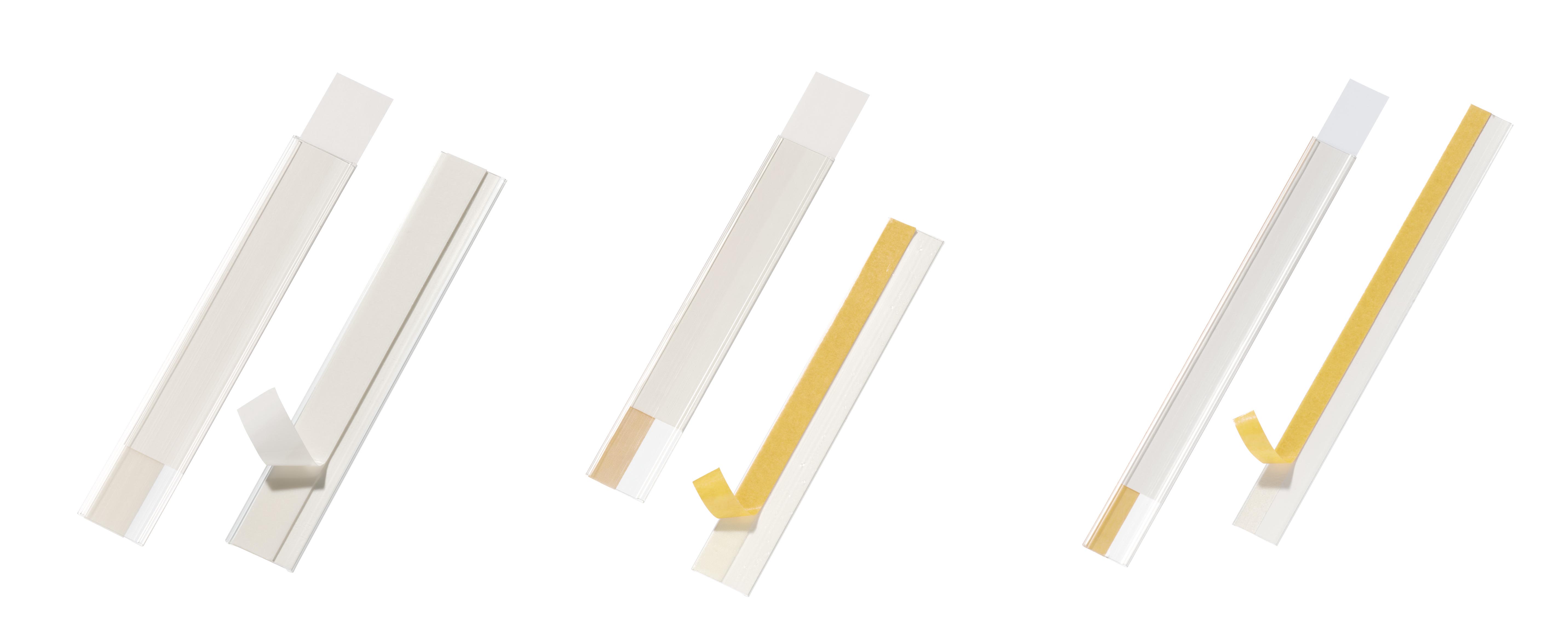 Självhäftande skanningsbar etiketthållare för märkning av t ex hyllkanter. Öppen upptill och på sidan. Skrivhöjd 2 cm, längd 20 cm.