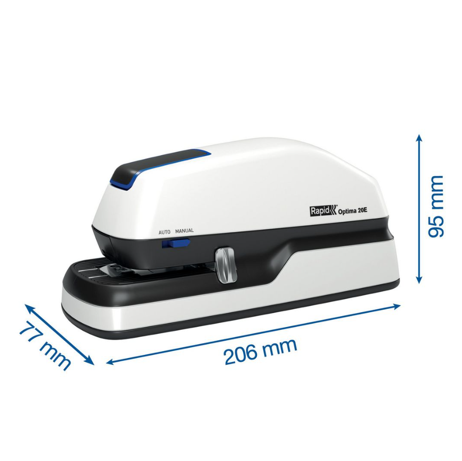 Rexel Optima® 20 är en robust och kompakt elektrisk häftapparat med praktiska funktioner som gör häftningen enkel och effektiv både manuellt och automatiskt.