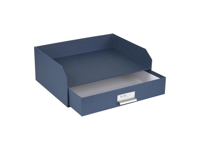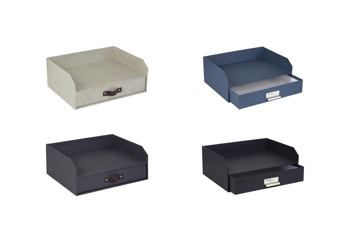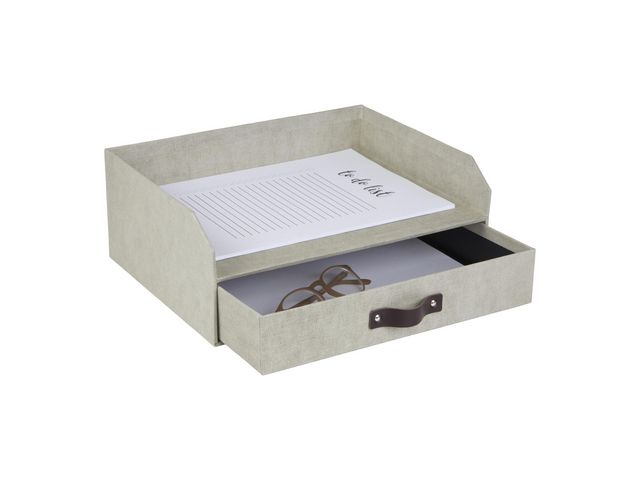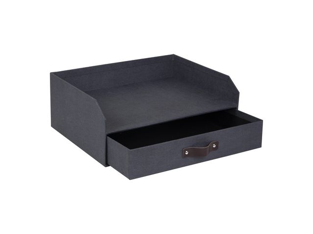 Snygg och praktisk förvaringslåda med en låda och ett brevfack. Perfekt för att hålla ordning på dina A4-dokument. Få ett snyggt och välorganiserat skrivbord på ett ögonblick! Gummifötter medföljer för att skydda underlägget och öka stabiliteten.Tillverkad i återvunnen fiberboard.Mått: 33,5x25,5x13cm.Färg: mörk grå