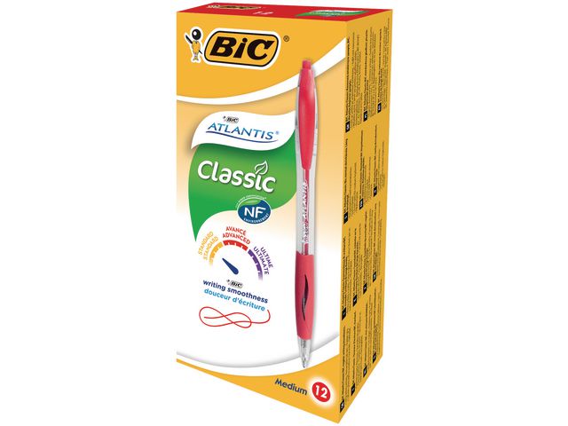 Kulspetspennan BIC® Atlantis™ har EasyGlide-bläck som gör det behagligt att skriva. Kulspetspennan BIC® Atlantis™ passar utmärkt för dagligt skrivande. Med det bekväma mjuka gummigreppet blir du stadig på handen och kan skriva utan att pennan glider ur händerna, och med pennans EasyGlide-bläck blir skriften tydlig och jämn. Pennans 1mm spets ger jämna linjer, så att dina föreläsnings- eller mötesanteckningar blir klara och tydliga. Fickklämman på pennhuven är praktisk. Du kan ha pennan på dig hela tiden genom att fästa den på bland annat skjortficka, anteckningsblock och mappar.