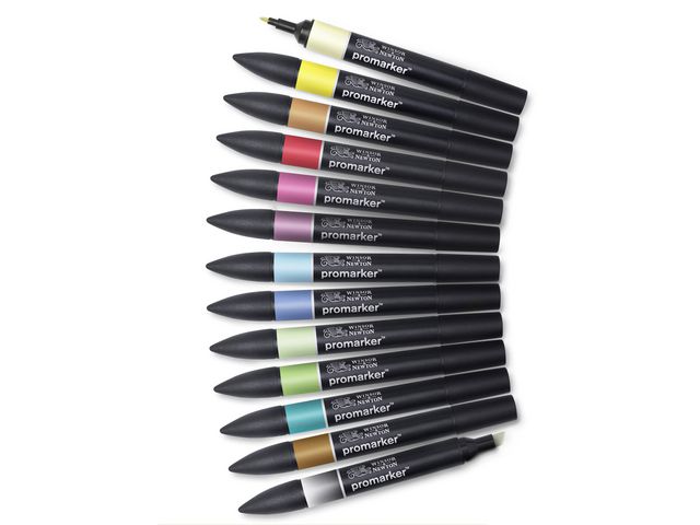 ProMarker-pennorna är alkoholbaserade och finns i två olika spetsar: En fin spets och en bred. Pennan ger jämna och fina färgfält utan spår av penndrag och passar utmärkt till serieteckning, illustrationer, färgläggning eller manga. Denna förpackning innehåller 12 olika softa färger: Buttercup, Lemon, Gold, Lipstick red, Cerise, Fuchsia pink, Arctic blue, Cobalt blue, Meadow green, Apple, Turquoise, Cocoa & Blender.