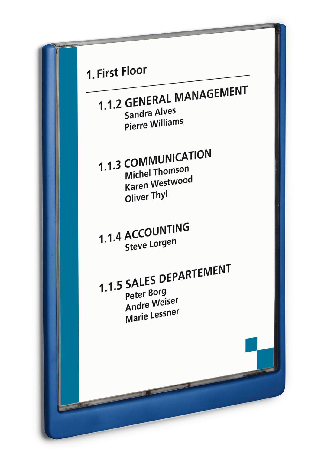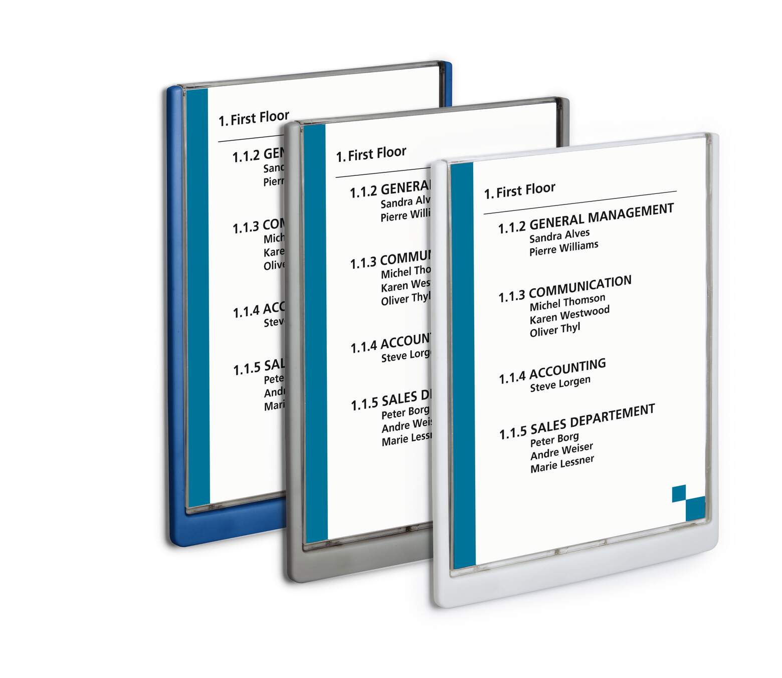 Dörr- och väggskyltar i olika utförande hjälper besökare att orientera sig och informerar om vem, vilken avdelning, funktion eller konferensrum som som finns var i lokalen. Skyltserien CLICK SIGN finns i fyra färger för möjligheten att ha olika färger på olika avdelningar eller våningsplan eller helt enkelt för att det är en färg som passar i verksamheten. CLICK SIGN har en nedfällbar frontskiva som det vita arket med text sitter skyddat bakom. Skruv, plugg och självhäftande remsor ingår i monteringskitet, liksom monteringsanvisning och ett vit insticksskylt. Designa den här stående A4 skylten (210x297) med hjälp av gratisprogrammet DURAPRINT® som finns på www.duraprint.se och skriv ut på A4 ark , som beställs separat. Tillbehör: A4-ark för utskrift i laserskrivare, artikelnummer 485602