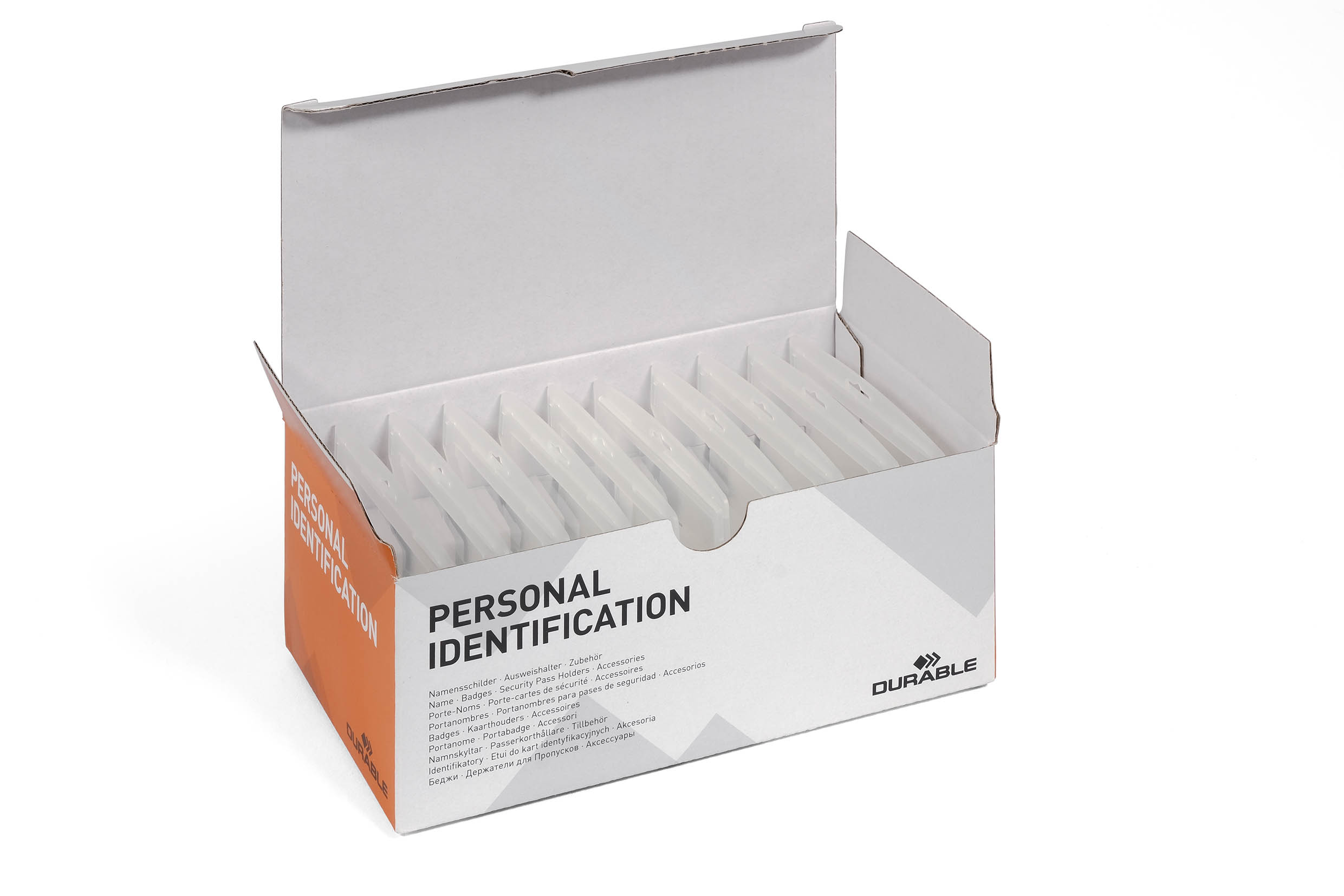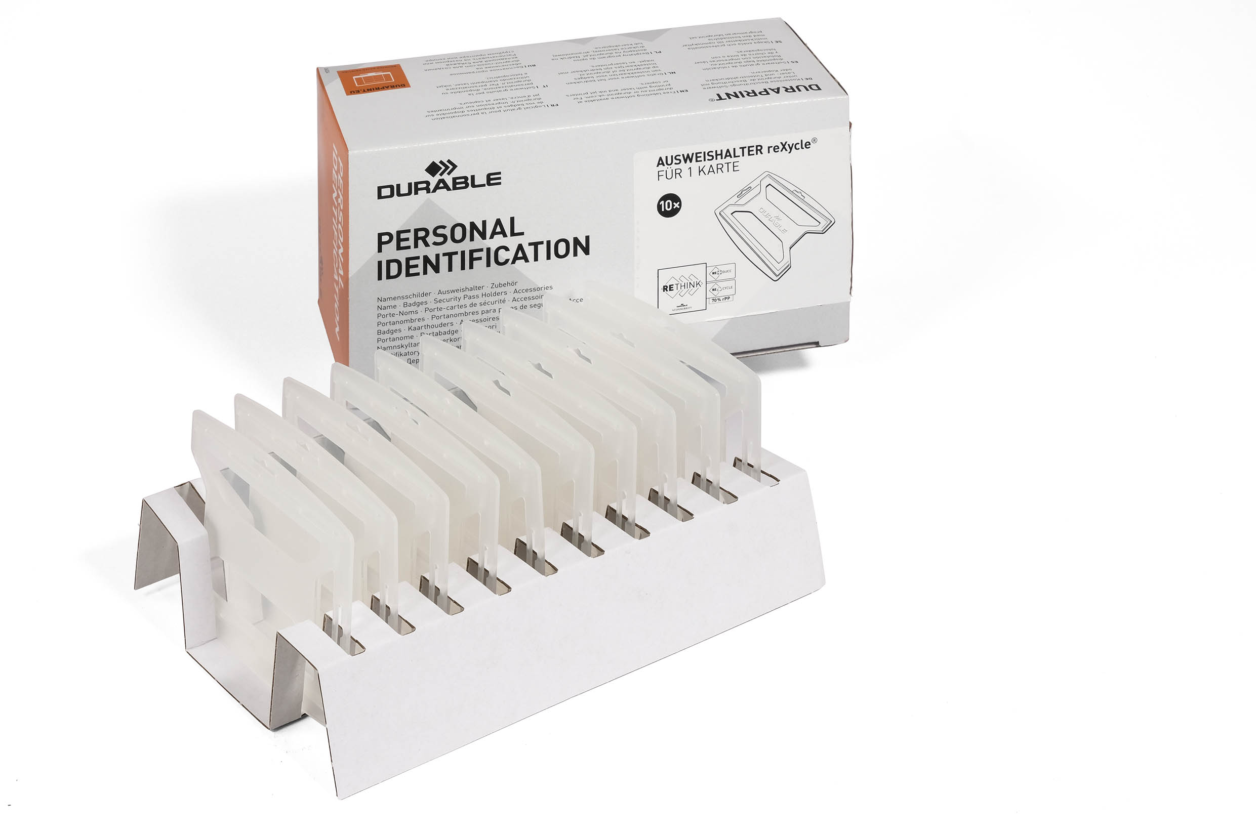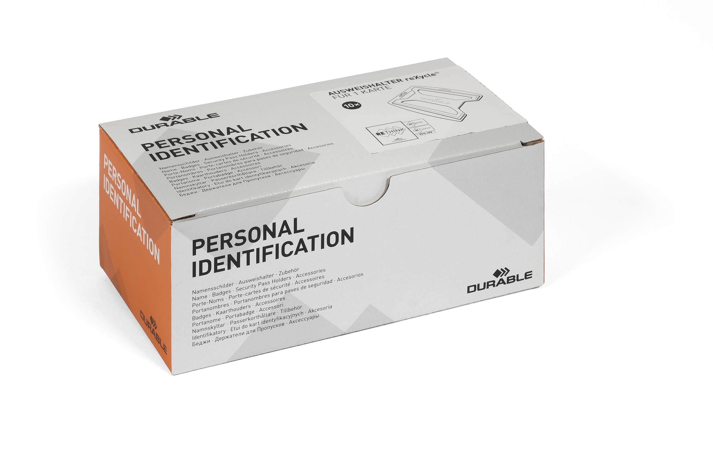 ID-korthållare för ett kort, tillverkad av 70 % återvunnen polypropen. Utförd med sidourtag för enkel borttagning av kort. Korthållaren kan användas i både stående och liggande orientering.