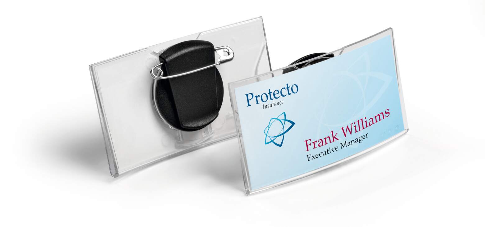 Konferensdeltagare, besökare på företag, personal på mässor, i butiker, serviceyrken och säljare - listan kan göras lång där det finns behov av namnbrickor i olika storlekar, design och fastsättningsmöjligheter. Den här 40x75mm skylten är av akryl och lätt konvex, vilket gör att texten blir extra lätt att läsa. Vridbar kombiklämma som ger valmöjlighet hur skylten ska sättas fast. Tumgrepp gör det enkelt att ta ut kortet. Vita etiketter medföljer. Etiketter på A4-ark för utskrift i skrivare kan beställas separat. Använd gratisprogrammet DURAPRINT® som finns på www.duraprint.se för att skapa och skriva ut snygga namnetiketter. Tillbehör: Badgemaker® etiketter på A4- ark för utskrift i skrivare, artikelnr 145302