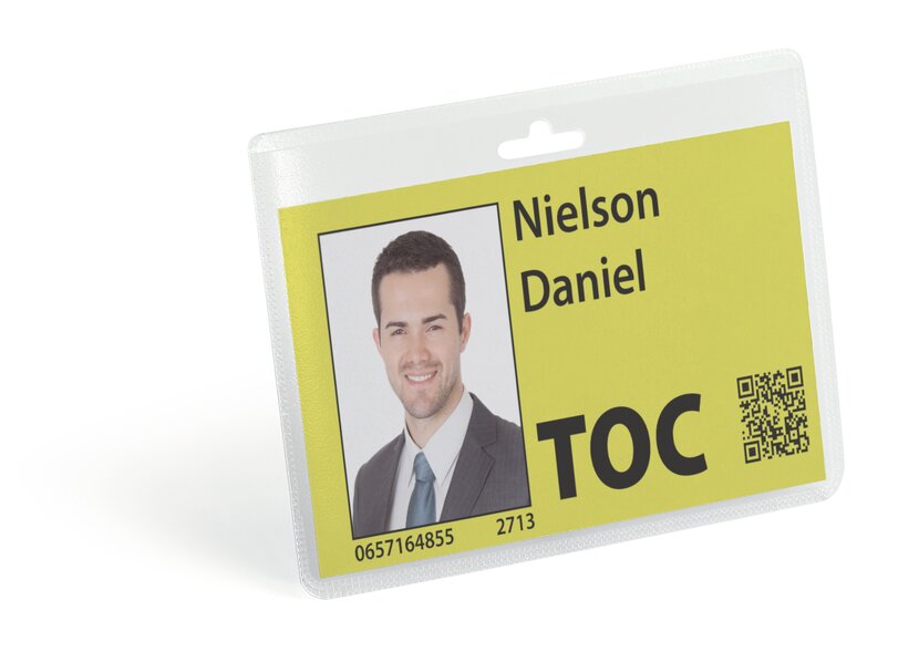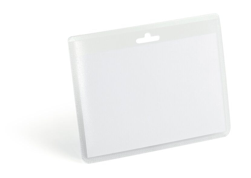 Namnskylt 60x90 mm med Eurohål PP är ett slutet fodral som skyddar namnetiketten. Med stansat hål för att enkelt kunna fästas med kedja, klämma, nyckelband eller jojo. Perfekt för mässor, kongresser, VIP-tillställningar och stora event. Det robusta PP-materialet skyddar etiketten från smuts och skador samtidigt som den bibehåller ett professionellt utseende.