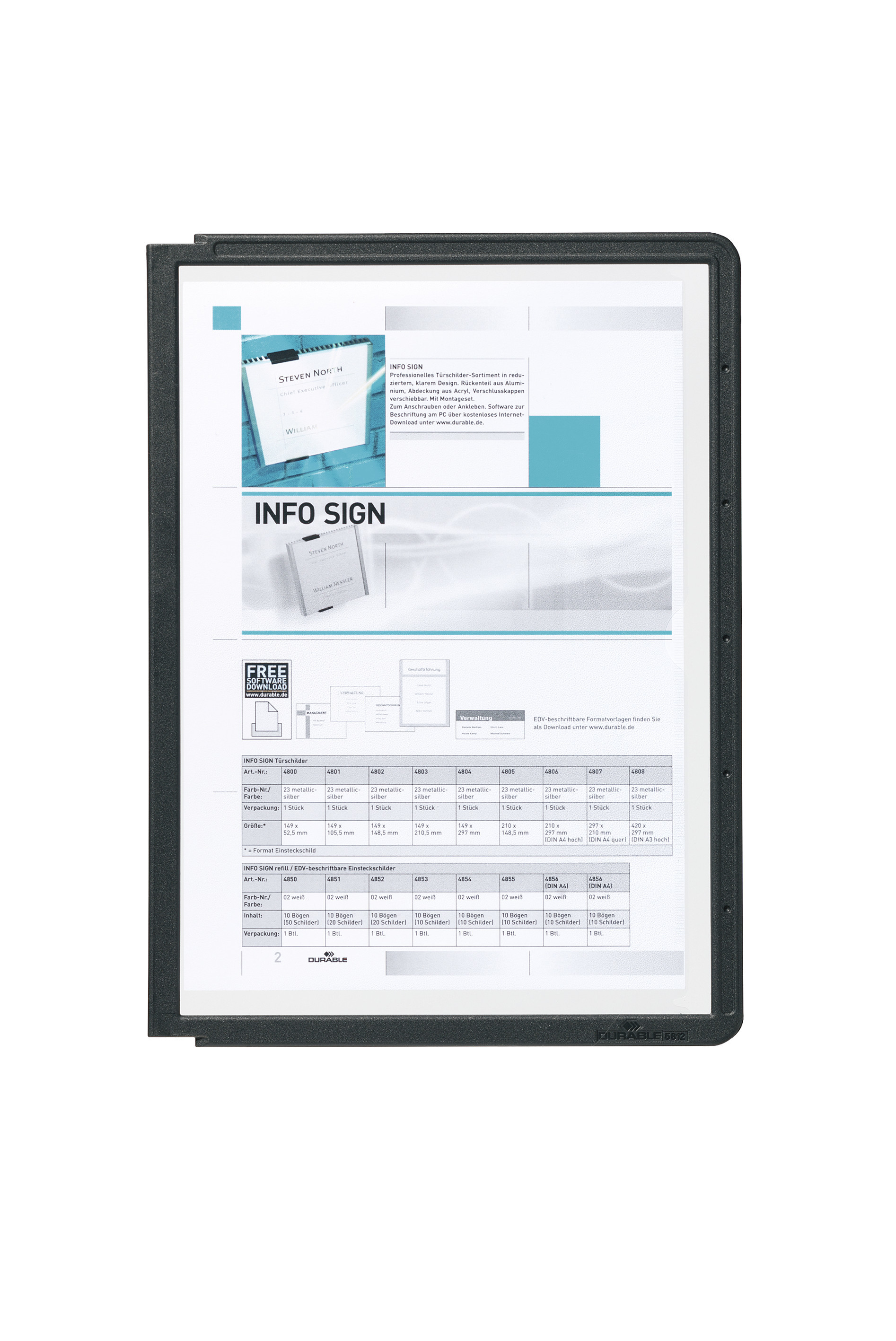 Panelen är utrustad med en färgad profilram runtom som förbättrar överskådligheten och gör det lättare att strukturera information visuellt. Den lågreflekterande och skanningssäkrade plastfolien ger god läsbarhet även under stark belysning och möjliggör samtidig digitalisering utan störande reflektioner. För ännu bättre tydlighet kan panelen kompletteras med rubrikhållare (art.nr 5603 och 5609). Produkten är konstruerad för långvarig användning och levereras med 5 års garanti.