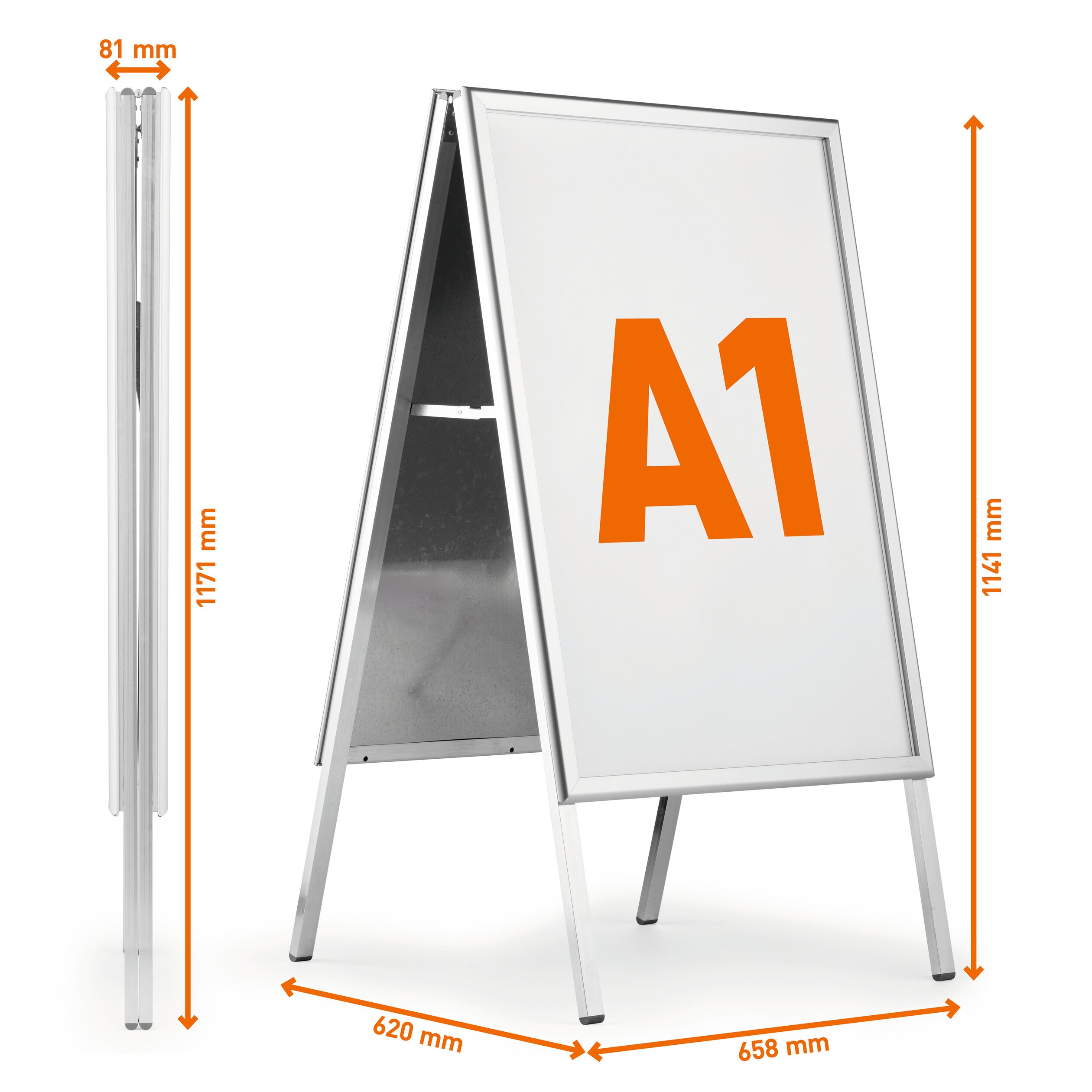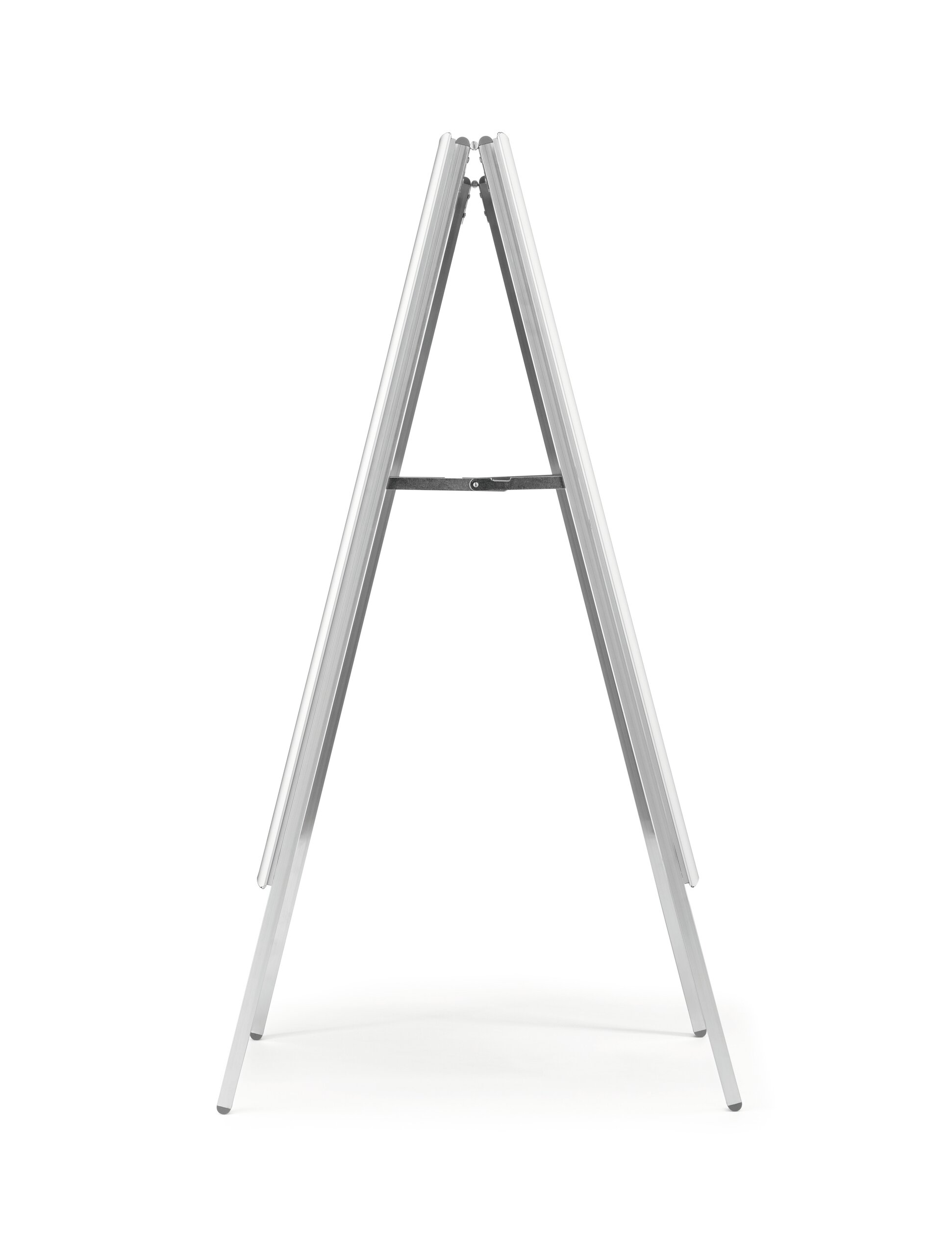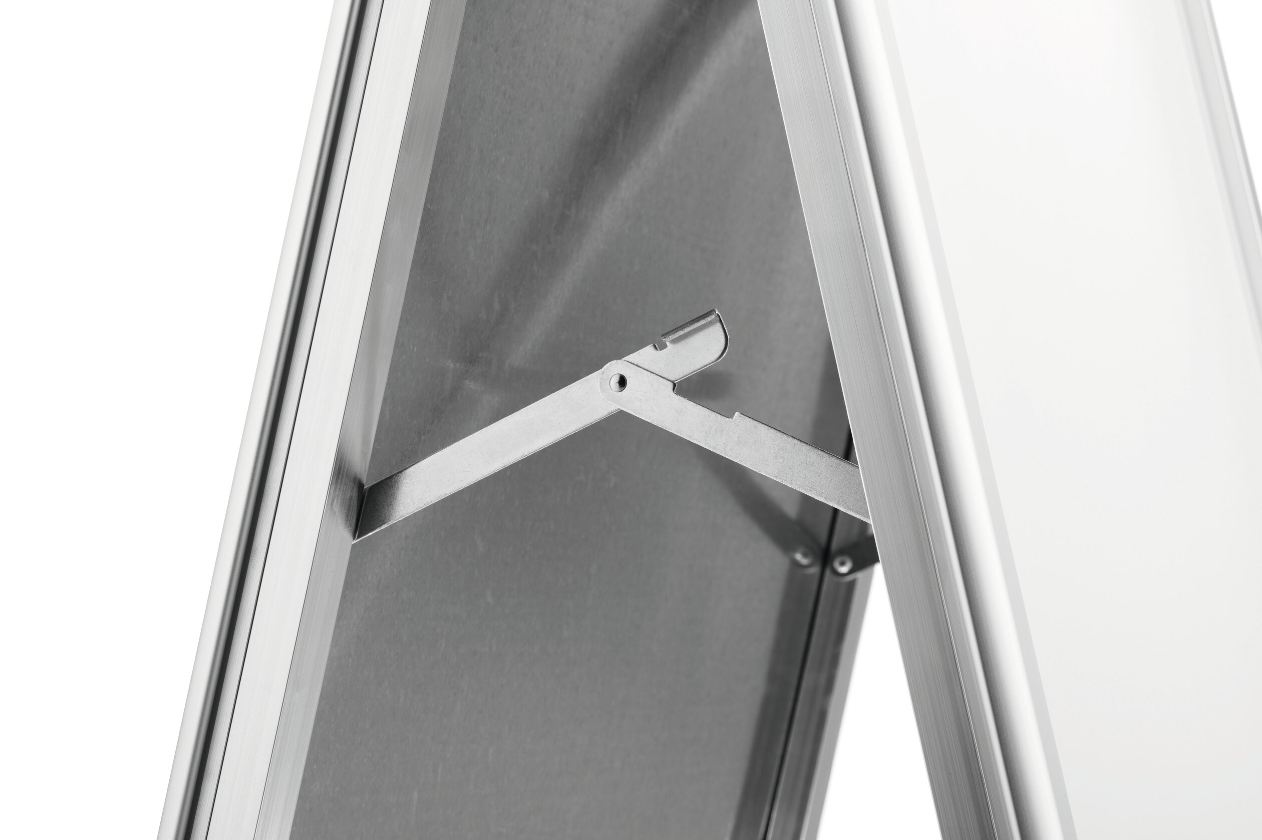 Utfällbar gatupratare som gör din verksamhet synlig för förbipasserande och hjälper till att locka kunder till exempelvis caféer, restauranger, butiker, museer, turistbyråer, skönhetssalonger eller evenemang. Skyltstället är utrustat med två snäppramar i aluminium och är anpassat för både utomhus- och inomhusbruk.