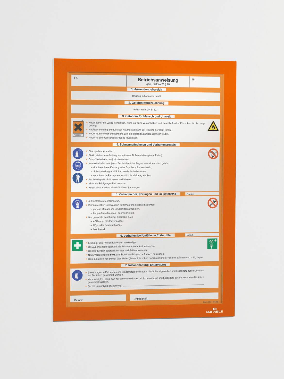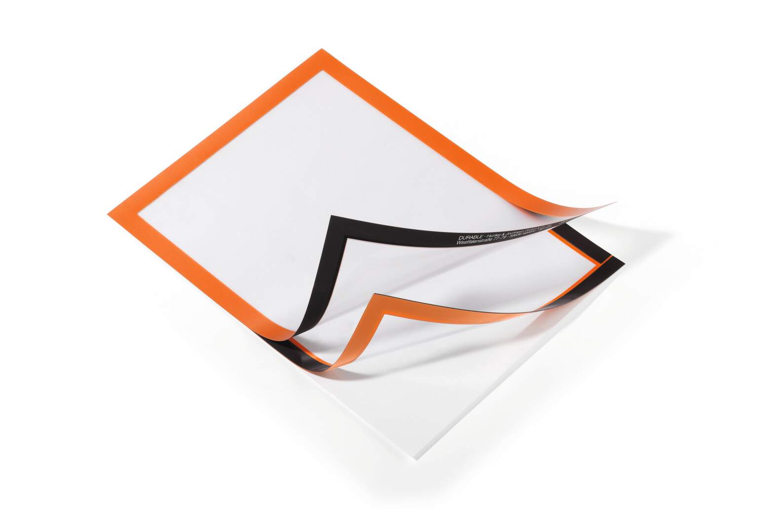 Använd självhäftande DURAFRAME® inforamar för att visa och presentera kampanjerbjudanden, öppettider, skyltar och annan tillfällig eller mer varaktig information på ett professionellt sätt. Enkelt att sätta i eller skifta budskap genom att lyfta framsidan med magnetstängning. Lätt att sätta upp - utan verktyg eller andra tillbehör - på fasta och släta ytor. Snyggare och enklare hantering än t ex tejp, häftstift eller häftklammer. Ramen ser likadan ut på fram och baksidan, vilket är bra när den placeras på glasrutor för dubbelsidigt budskap. Ramen går att ta bort från glasrutor. Målade, belagda eller laminerade ytor kan skadas om ramen tas bort. För dokument i A4 format. Yttermått 236x323 mm. Färg: orange. Förpackning med 10 st. Monteringsanvisning och ansvarsfriskrivning: Undvik att fästa självhäftande DURAFRAME® på målade, belagda eller laminerade ytor samt underlag som tapeter, porösa material och non-stick ytor. Se till att den yta som används är fri från damm, fett och smuts som kan påverka fästförmågan hos klistret. Säkerställ att nymålade eller lackerade ytor har torkat ordentligt innan du applicerar DURAFRAME® självhäftande inforam. Användare rekommenderas att kontrollera skicket på ytan före användning. DURABLE tar inte ansvar för eventuella skador som uppkommit genom felaktig användning. För användning på känsliga underlag som t ex tapeter, vänligen använd DURAFRAME® WALLPAPER. För användning på solexponerade glasytor rekommenderar vi DURAFRAME® SUN.