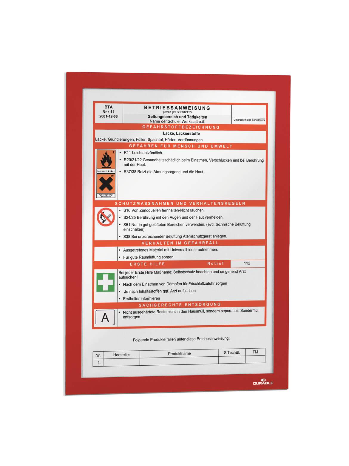 Använd självhäftande DURAFRAME® inforamar för att visa och presentera kampanjerbjudanden, öppettider, skyltar och annan tillfällig eller mer varaktig information på ett professionellt sätt. Enkelt att sätta i eller skifta budskap genom att lyfta framsidan med magnetstängning. Lätt att sätta upp - utan verktyg eller andra tillbehör - på fasta och släta ytor. Snyggare och enklare hantering än t ex tejp, häftstift eller häftklammer. Ramen ser likadan ut på fram och baksidan, vilket är bra när den placeras på glasrutor för dubbelsidigt budskap. Ramen går att ta bort från glasrutor. Målade, belagda eller laminerade ytor kan skadas om ramen tas bort. För dokument i A4 format. Yttermått 236x323 mm. Färg: röd. Förpackning med 10 st. Monteringsanvisning och ansvarsfriskrivning: Undvik att fästa självhäftande DURAFRAME® på målade, belagda eller laminerade ytor samt underlag som tapeter, porösa material och non-stick ytor. Se till att den yta som används är fri från damm, fett och smuts som kan påverka fästförmågan hos klistret. Säkerställ att nymålade eller lackerade ytor har torkat ordentligt innan du applicerar DURAFRAME® självhäftande inforam. Användare rekommenderas att kontrollera skicket på ytan före användning. DURABLE tar inte ansvar för eventuella skador som uppkommit genom felaktig användning. För användning på känsliga underlag som t ex tapeter, vänligen använd DURAFRAME® WALLPAPER. För användning på solexponerade glasytor rekommenderar vi DURAFRAME® SUN.