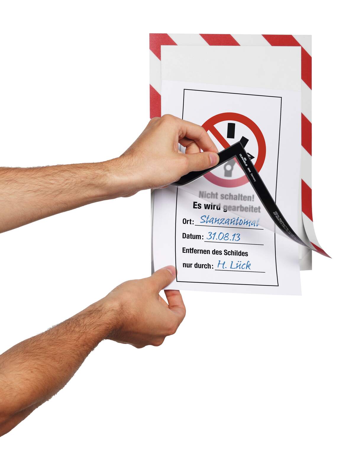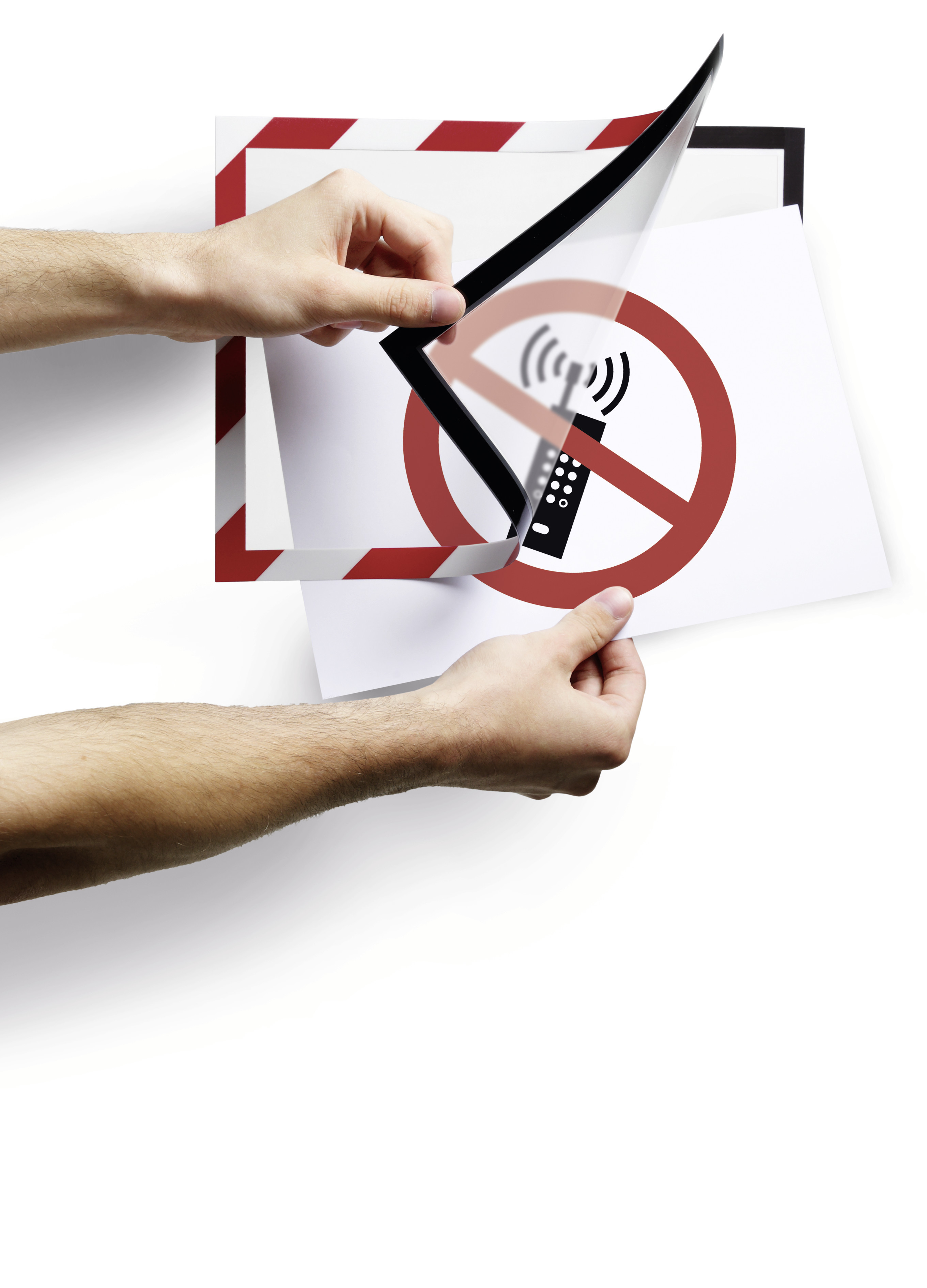 Sätt upp tillfällig eller mer varaktig säkerhets och varningsinformation på ett professionellt sätt med självhäftande DURAFRAME® SECURITY inforamar. Enkelt att sätta i eller skifta skylt genom att lyfta framsidan med magnetstängning. Lätt att sätta upp - utan verktyg eller andra tillbehör - på fasta och släta ytor. Snyggare och enklare hantering än t ex tejp, häftstift eller häftklammer. Ramen ser likadan ut på fram och baksidan, vilket är bra när den placeras på glasrutor för dubbelsidigt budskap. Ramen går att ta bort från glasrutor. Målade, belagda eller laminerade ytor kan skadas om ramen tas bort. För dokument i A4 format. Yttermått 236x323 mm. Färg: röd/vit för brandskyddsinformation i enlighet med ISO 3864-4 för säkerhetsfärger Förpackning med 2 st. Monteringsanvisning och ansvarsfriskrivning: Undvik att fästa självhäftande DURAFRAME® på målade, belagda eller laminerade ytor samt underlag som tapeter, porösa material och non-stick ytor. Se till att den yta som används är fri från damm, fett och smuts som kan påverka fästförmågan hos klistret. Säkerställ att nymålade eller lackerade ytor har torkat ordentligt innan du applicerar DURAFRAME® självhäftande inforam. Användare rekommenderas att kontrollera skicket på ytan före användning. DURABLE tar inte ansvar för eventuella skador som uppkommit genom felaktig användning. För användning på känsliga underlag som t ex tapeter, vänligen använd DURAFRAME® WALLPAPER. För användning på solexponerade glasytor rekommenderar vi DURAFRAME® SUN.