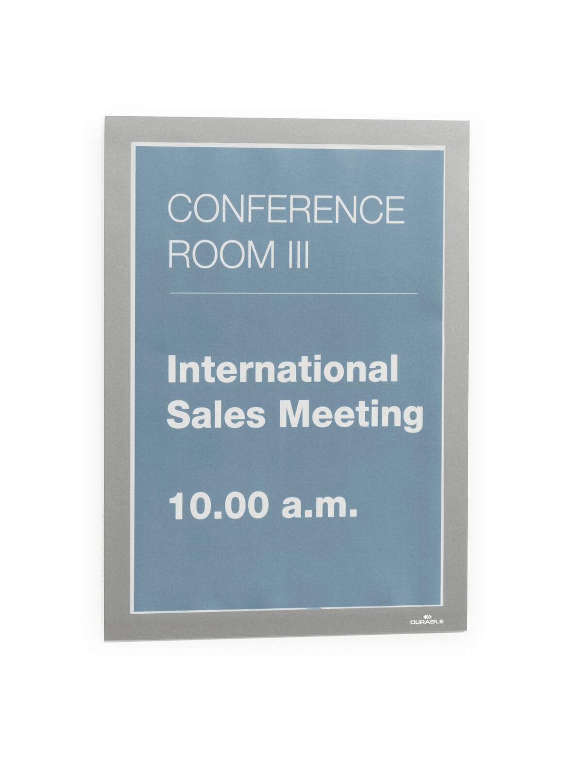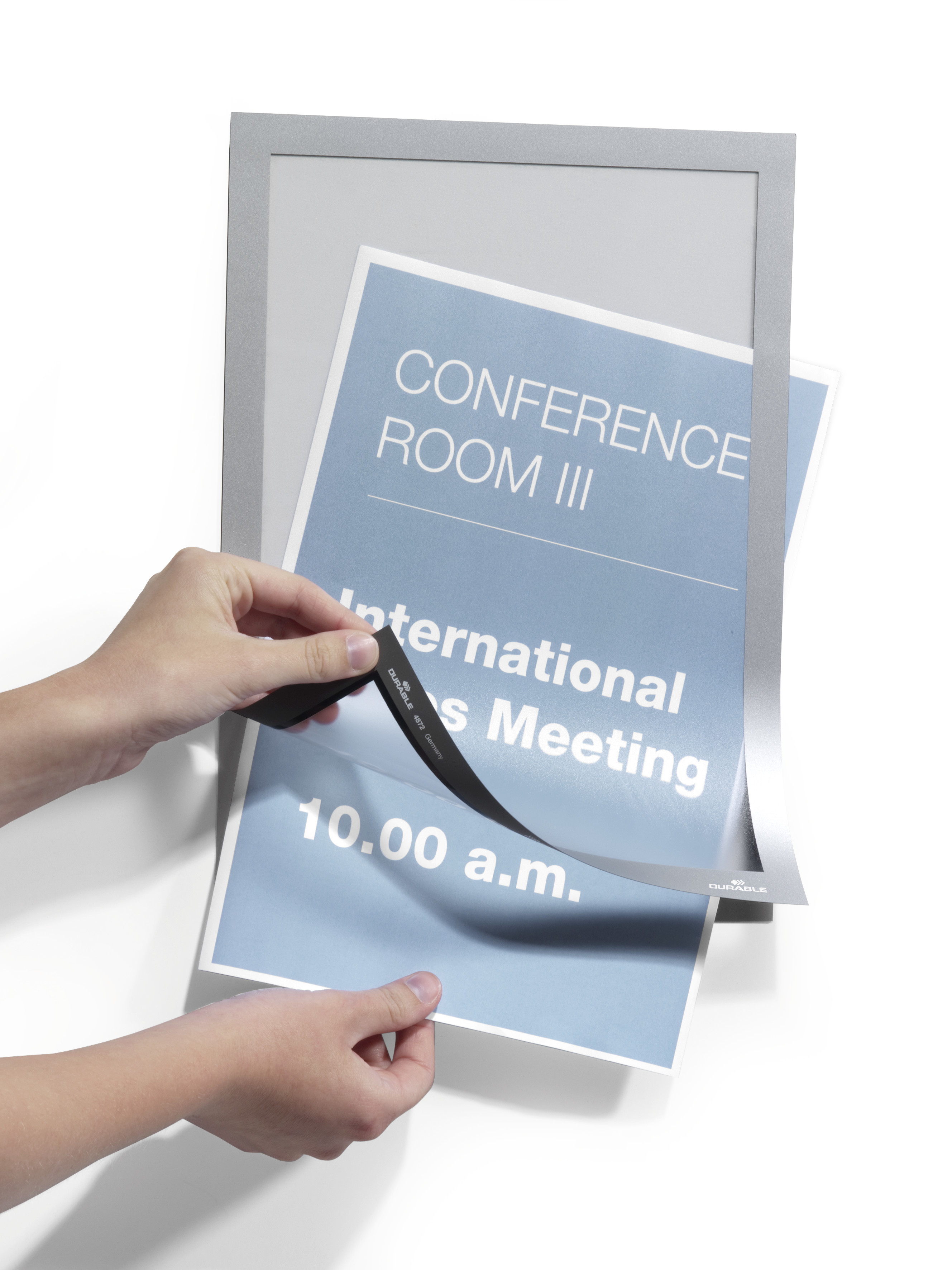 Använd självhäftande DURAFRAME® inforamar för att visa och presentera kampanjerbjudanden, öppettider, skyltar och annan tillfällig eller mer varaktig information på ett professionellt sätt. Enkelt att sätta i eller skifta budskap genom att lyfta framsidan med magnetstängning. Lätt att sätta upp - utan verktyg eller andra tillbehör - på fasta och släta ytor. Snyggare och enklare hantering än t ex tejp, häftstift eller häftklammer. Ramen ser likadan ut på fram och baksidan, vilket är bra när den placeras på glasrutor för dubbelsidigt budskap. Ramen går att ta bort från glasrutor. Målade, belagda eller laminerade ytor kan skadas om ramen tas bort. För dokument i A4 format. Yttermått 236x323 mm. Färg: silver. Förpackning med 1 st. Monteringsanvisning och ansvarsfriskrivning: Undvik att fästa självhäftande DURAFRAME® på målade, belagda eller laminerade ytor samt underlag som tapeter, porösa material och non-stick ytor. Se till att den yta som används är fri från damm, fett och smuts som kan påverka fästförmågan hos klistret. Säkerställ att nymålade eller lackerade ytor har torkat ordentligt innan du applicerar DURAFRAME® självhäftande inforam. Användare rekommenderas att kontrollera skicket på ytan före användning. DURABLE tar inte ansvar för eventuella skador som uppkommit genom felaktig användning. För användning på känsliga underlag som t ex tapeter, vänligen använd DURAFRAME® WALLPAPER. För användning på solexponerade glasytor rekommenderar vi DURAFRAME® SUN.
