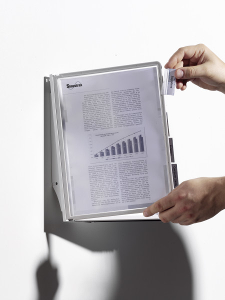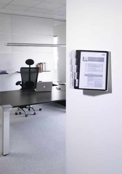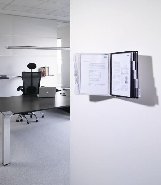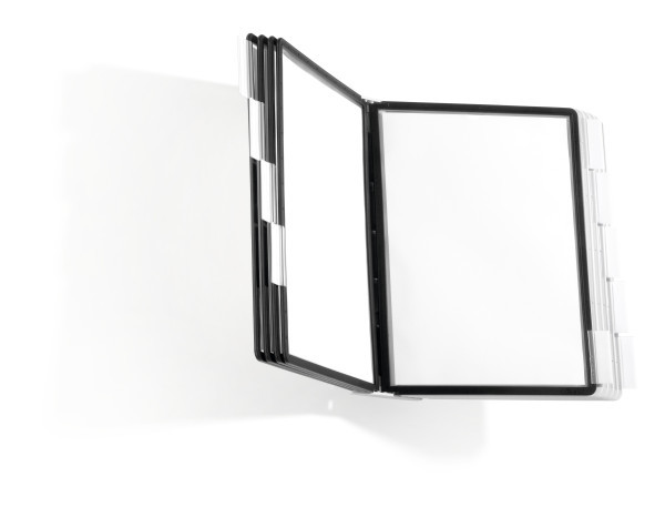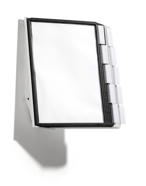 Komplett väggställ med 10 paneler (5 svarta, 5 grå) för A4-format och rubrikhållare 58 mm. Enkelt att bläddra i. Tillverkad av ABS plast. Panelerna i reflexfri PP-plast. Monteras direkt på väggen, en eller flera bredvid varandra. 5 års garanti.