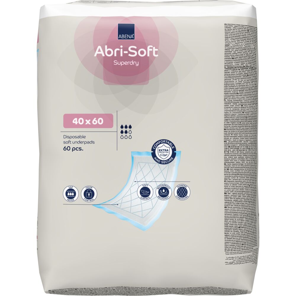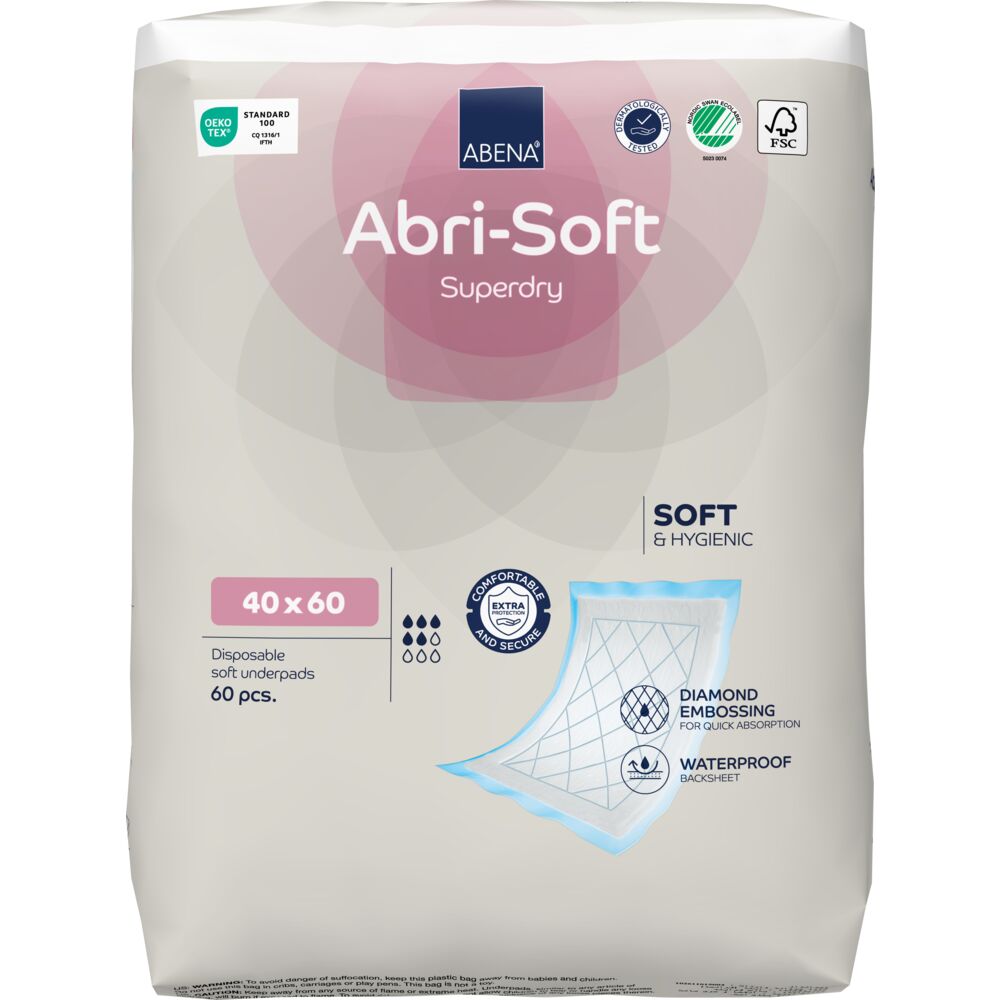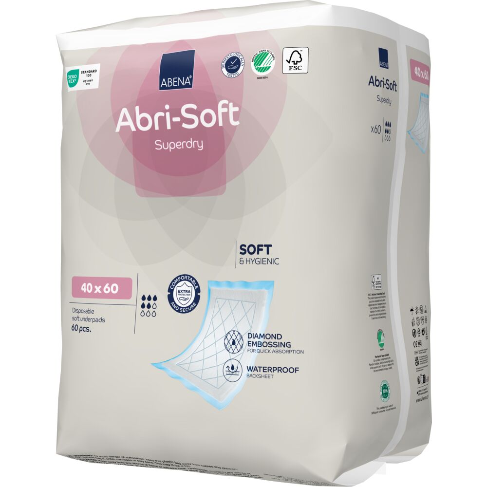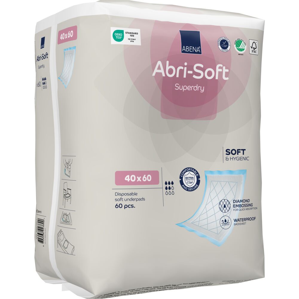 Abri-Soft Superdry är ett skyddande engångsunderlägg för t.ex. sängar och stolar. Det är lämpligt vid inkontinens, men även för osterila procedurer. Underlägget innehåller både fluff och SAP, vilket kapslar in vätskan ännu snabbare och håller ytan torr och behaglig. Systemet minskar också risken för oönskad lukt. Dessutom har underlägget förseglade kanter för optimalt läckageskydd, och ytan är täckt med ett mjukt nonwoven-material som ger ännu högre komfort. Med engångsunderlägg minskar risken för kontaminering. Abri-Soft Superdry har lätt till medelhög absorptionskapacitet och finns i olika storlekar. Det är också tillgängligt i en variant med bäddflikar och i en variant med tejp, vilket är praktiskt för aktiva eller rastlösa användare, eftersom underlägget fixeras mot lakanet