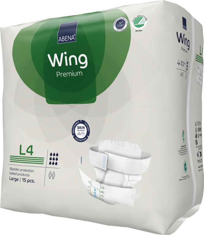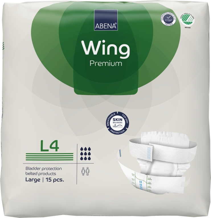 ABENA Wing är vårt förstklassiga sortiment av bältesprodukter för måttlig till kraftig inkontinens. Samtliga produkter är Svanenmärkta. Alla inkontinensprodukter har full andningsförmåga och är utrustade med läckagebarriärer för extra skydd. De dermatologiskt testade produkterna med ABENA:s Top-Dry-teknik skyddar och vårdar huden genom att hålla det exponerade området torrt och behagligt även efter flera läckage. Det mjuka nonwoven-bältet är integrerat i produktens baksida och erbjuder en bra fixeringslösning för alla kroppsformer. Bältet är extra långt, så du behöver inte använda något separat förlängningsbälte. Optimal passform tack vare resårer i både fram- och baksidan. Lättjusterade fästen (kardborreband på bältet och kombitejp på produkten) som kan flyttas flera gånger. Den unika passformen gör ABENA Wing till en utmärkt lösning för vårdtagare som kan klara sig själva. Med hjälp av våtindikatorn och rutsystemet kan användare och vårdgivare hitta den produkt som har rätt absorptionsnivå, vilket också underlättar vid byten. Odörsystemet minskar risken för oönskad lukt.
