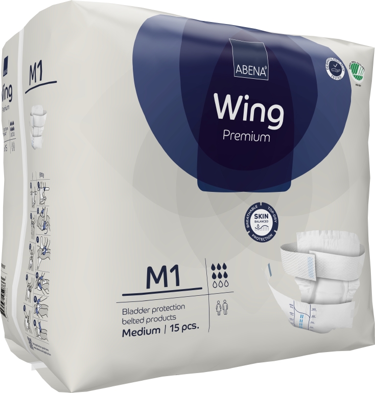 ABENA Wing är vårt förstklassiga sortiment av bältesprodukter för måttlig till kraftig inkontinens. Samtliga produkter är Svanenmärkta. Alla inkontinensprodukter har full andningsförmåga och är utrustade med läckagebarriärer för extra skydd. De dermatologiskt testade produkterna med ABENA:s Top-Dry-teknik skyddar och vårdar huden genom att hålla det exponerade området torrt och behagligt även efter flera läckage. Det mjuka nonwoven-bältet är integrerat i produktens baksida och erbjuder en bra fixeringslösning för alla kroppsformer. Bältet är extra långt, så du behöver inte använda något separat förlängningsbälte. Optimal passform tack vare resårer i både fram- och baksidan. Lättjusterade fästen (kardborreband på bältet och kombitejp på produkten) som kan flyttas flera gånger. Den unika passformen gör ABENA Wing till en utmärkt lösning för vårdtagare som kan klara sig själva. Med hjälp av våtindikatorn och rutsystemet kan användare och vårdgivare hitta den produkt som har rätt absorptionsnivå, vilket också underlättar vid byten. Odörsystemet minskar risken för oönskad lukt.