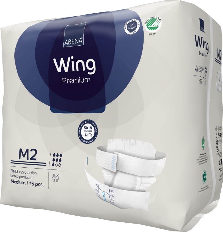 ABENA Wing är vårt förstklassiga sortiment av bältesprodukter för måttlig till kraftig inkontinens. Samtliga produkter är Svanenmärkta. Alla inkontinensprodukter har full andningsförmåga och är utrustade med läckagebarriärer för extra skydd. De dermatologiskt testade produkterna med ABENA:s Top-Dry-teknik skyddar och vårdar huden genom att hålla det exponerade området torrt och behagligt även efter flera läckage. Det mjuka nonwoven-bältet är integrerat i produktens baksida och erbjuder en bra fixeringslösning för alla kroppsformer. Bältet är extra långt, så du behöver inte använda något separat förlängningsbälte. Optimal passform tack vare resårer i både fram- och baksidan. Lättjusterade fästen (kardborreband på bältet och kombitejp på produkten) som kan flyttas flera gånger. Den unika passformen gör ABENA Wing till en utmärkt lösning för vårdtagare som kan klara sig själva. Med hjälp av våtindikatorn och rutsystemet kan användare och vårdgivare hitta den produkt som har rätt absorptionsnivå, vilket också underlättar vid byten. Odörsystemet minskar risken för oönskad lukt.