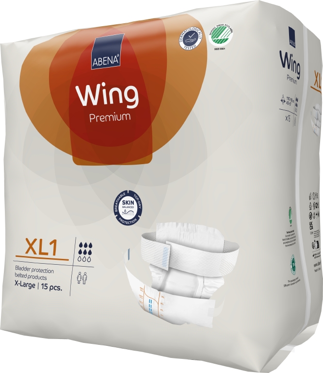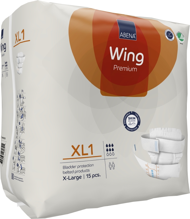 ABENA Wing är vårt förstklassiga sortiment av bältesprodukter för måttlig till kraftig inkontinens. Samtliga produkter är Svanenmärkta. Alla inkontinensprodukter har full andningsförmåga och är utrustade med läckagebarriärer för extra skydd. De dermatologiskt testade produkterna med ABENA:s Top-Dry-teknik skyddar och vårdar huden genom att hålla det exponerade området torrt och behagligt även efter flera läckage. Det mjuka nonwoven-bältet är integrerat i produktens baksida och erbjuder en bra fixeringslösning för alla kroppsformer. Bältet är extra långt, så du behöver inte använda något separat förlängningsbälte. Optimal passform tack vare resårer i både fram- och baksidan. Lättjusterade fästen (kardborreband på bältet och kombitejp på produkten) som kan flyttas flera gånger. Den unika passformen gör ABENA Wing till en utmärkt lösning för vårdtagare som kan klara sig själva. Med hjälp av våtindikatorn och rutsystemet kan användare och vårdgivare hitta den produkt som har rätt absorptionsnivå, vilket också underlättar vid byten. Odörsystemet minskar risken för oönskad lukt.