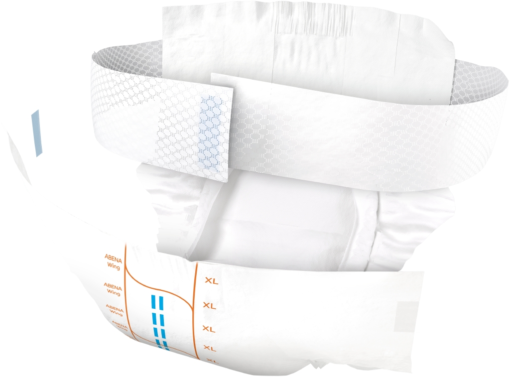 ABENA Wing är vårt förstklassiga sortiment av bältesprodukter för måttlig till kraftig inkontinens. Samtliga produkter är Svanenmärkta. Alla inkontinensprodukter har full andningsförmåga och är utrustade med läckagebarriärer för extra skydd. De dermatologiskt testade produkterna med ABENA:s Top-Dry-teknik skyddar och vårdar huden genom att hålla det exponerade området torrt och behagligt även efter flera läckage. Det mjuka nonwoven-bältet är integrerat i produktens baksida och erbjuder en bra fixeringslösning för alla kroppsformer. Bältet är extra långt, så du behöver inte använda något separat förlängningsbälte. Optimal passform tack vare resårer i både fram- och baksidan. Lättjusterade fästen (kardborreband på bältet och kombitejp på produkten) som kan flyttas flera gånger. Den unika passformen gör ABENA Wing till en utmärkt lösning för vårdtagare som kan klara sig själva. Med hjälp av våtindikatorn och rutsystemet kan användare och vårdgivare hitta den produkt som har rätt absorptionsnivå, vilket också underlättar vid byten. Odörsystemet minskar risken för oönskad lukt.