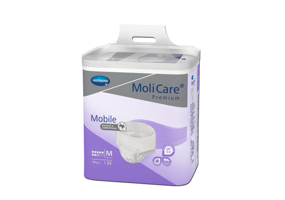 MoliCare® Premium Mobile with an absorbency of 8 drops are the absorbent disposable pants that meet the highest demands of users experiencing severe urinary incontinence.
