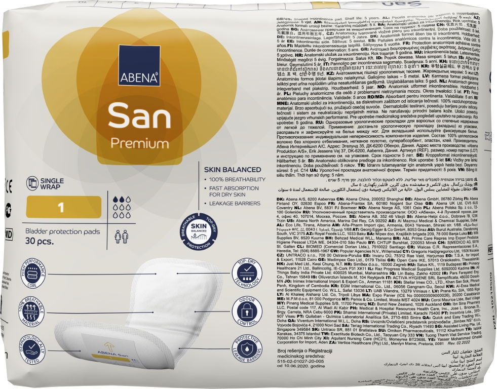 ABENA San 1-4 är vårt förstklassiga sortiment av kroppsformade skydd mot urinläckage vid lätt till måttlig inkontinens med självhäftande tejp. Den högeffektiva kärnan med Top-Dry-teknik skapar snabb absorption och en torr yta även efter flera läckage. Alla produkter har full andningsförmåga och är utrustade med osynliga läckagebarriärer för extra skydd. Tillsammans hjälper dessa funktioner till att skydda huden och bibehålla naturlig pH-balans i huden. Odörsystemet minskar risken för oönskad lukt. De dermatologiskt testade produkterna är Svanenmärkta och tillverkade av FSC-certifierade material.