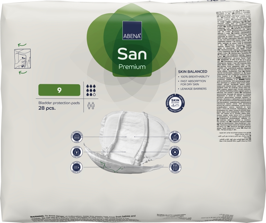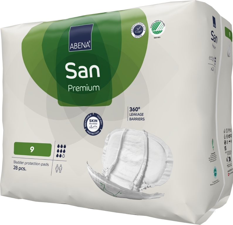 ABENA San 5–11 är vårt förstklassiga sortiment med kroppsformade skydd för måttlig till kraftig inkontinens. Den högeffektiva kärnan med Top-Dry-teknik skyddar och vårdar huden genom att hålla det exponerade området torrt och behagligt även efter flera läckage. Skydden har full andningsförmåga och både stående läckagebarriärer och tvärgående barriärer fram och bak för 360°-graders skydd mot läckage. Tillsammans hjälper dessa funktioner till att skydda huden och bibehålla naturlig pH-balans i huden. Odörsystemet minskar risken för oönskad lukt. Med hjälp av våtindikatorn och rutsystemet kan vårdtagare och vårdgivare hitta den produkt som har rätt absorptionsnivå, vilket även underlättar vid byten. Produkterna är dermatologiskt testade och bär det nordiska Svanenmärket. ABENA San i storlekarna 5–11 bör alltid användas med speciella fixeringsbyxor, till exempel våra Abri-Fix-produkter, för att få åtsittande passform och minska risken för läckage. ABENA:s tvådelade system med fixeringsbyxor och inkontinensskydd är en kostnadseffektiv lösning som använder mindre material, har mindre inverkan på miljön och höjer användarens livskvalitet.
