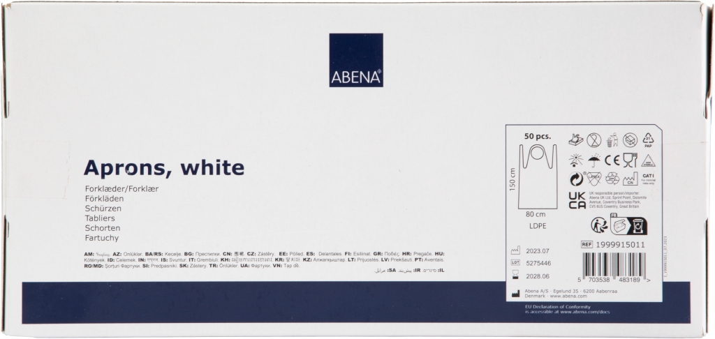 Engångsförkläde av plast, i förpackning. Förpackningen passar i hållare för handskar. Används som skydd för användaren där hög hygienisk standard behövs, t.ex. Inom hälso- och sjukvårdssektorn, vid livsmedelsproduktion, under produktion eller vid förpackning av varor.