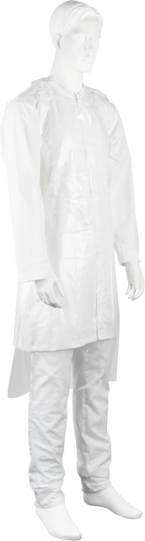 Engångsförkläde av plast, i förpackning. Förpackningen passar i hållare för handskar. Används som skydd för användaren där hög hygienisk standard behövs, t.ex. Inom hälso- och sjukvårdssektorn, vid livsmedelsproduktion, under produktion eller vid förpackning av varor.