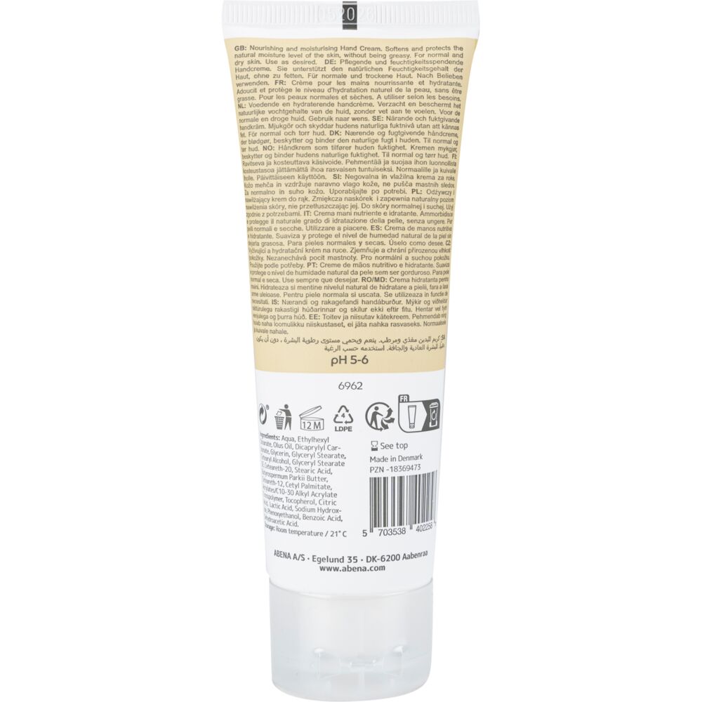 Mild vårdande handkräm som snabbt absorberas in i huden. Tack vare ett högt innehåll av vegetabiliska oljor, återfuktas huden utan att kännas fet. Innehåller glycerin som bibehåller fukt i huden. Handkrämen passar alla hudtyper och kan användas dagligen. Handkrämen kan finns i två olika fettinnehåll, 35 % fett och 21 % fett, båda är utan parfym. Endast för utvärtes bruk. Undvik ögonkontakt.