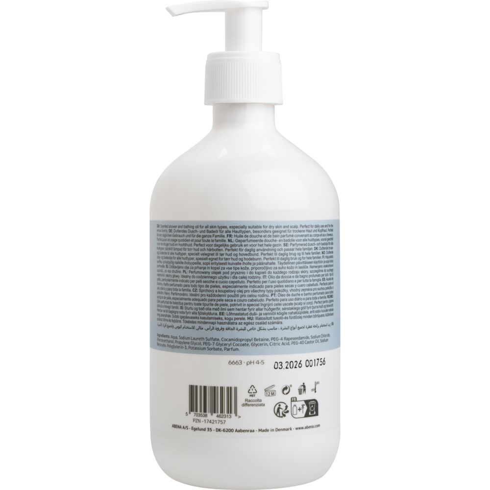 ABENAs dusch- och badolja har fantastiska tvättegenskaper och förhindrar att känslig hud blir torr genom att tillföra huden rikligt med fukt. Lämplig som hårschampo för personer med extra torr hårbotten. Personer med djupa hudveck rekommenderas använda den här oljan istället för tvål. Produkten innehåller ricinolja och i kombination med andra ingredienser ger denna eteriska olja produkten sin återsmörjande effekt. Vår dusch- och badolja är lämplig för både barn och vuxna. pH-värdet är noggrant anpassat för att matcha hudens korrekta pH-värde, vilket gynnar huden. Produkten får endast användas utvärtes på kroppen. Undvik kontakt med ögonen.